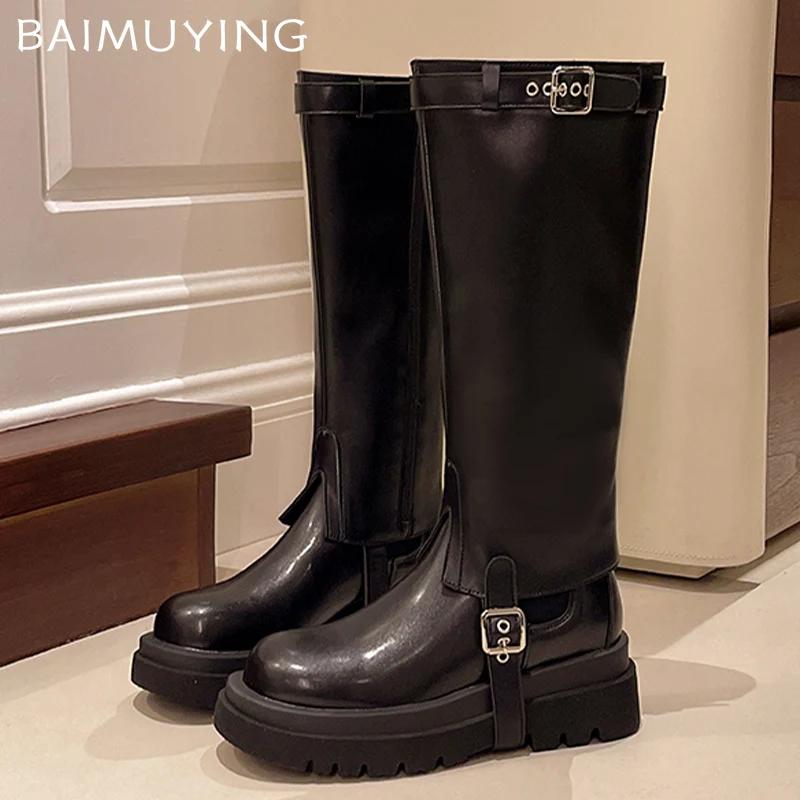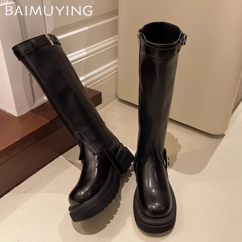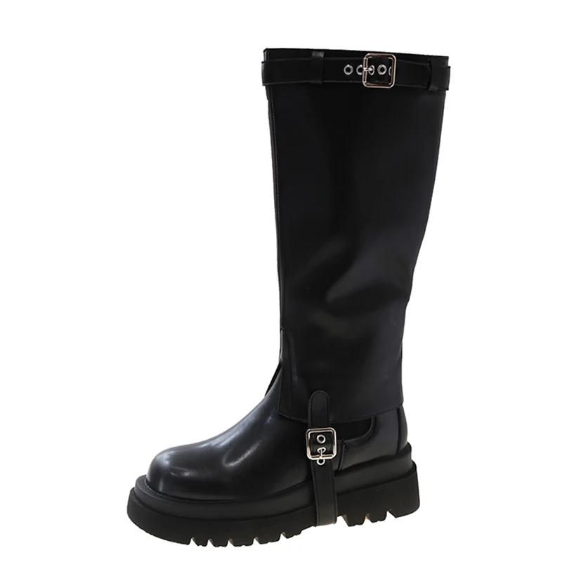 Кожаные женские высокие сапоги на платформе, массивные дизайнерские туфли на среднем каблуке с пряжкой, 2025, трендовая зимняя обувь до колена в готическом стиле, мотоциклетные ботинки Mujer