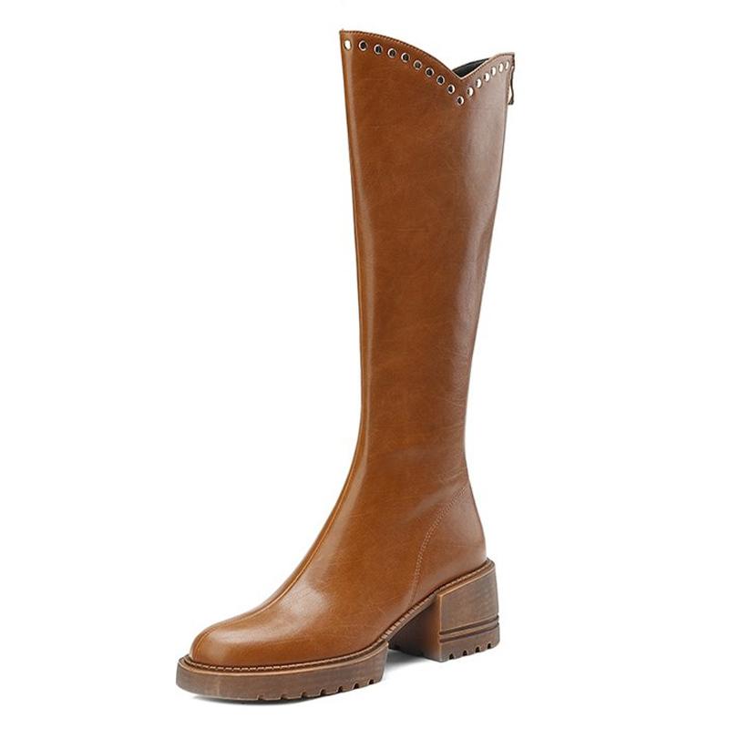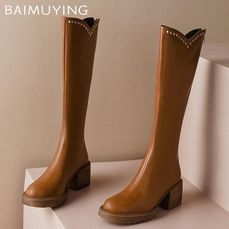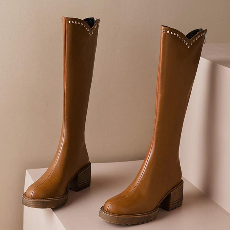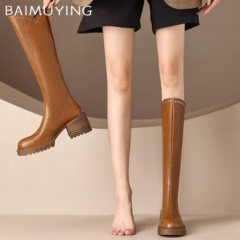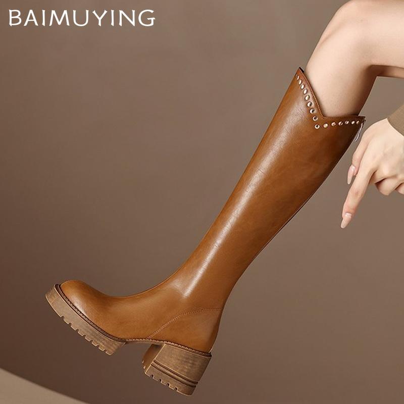 Кожаные толстые женские высокие сапоги, модные высокие каблуки, новый бренд, зимняя обувь 2025 года, трендовые высокие гладиаторские мотоциклетные ботинки до колена, женские