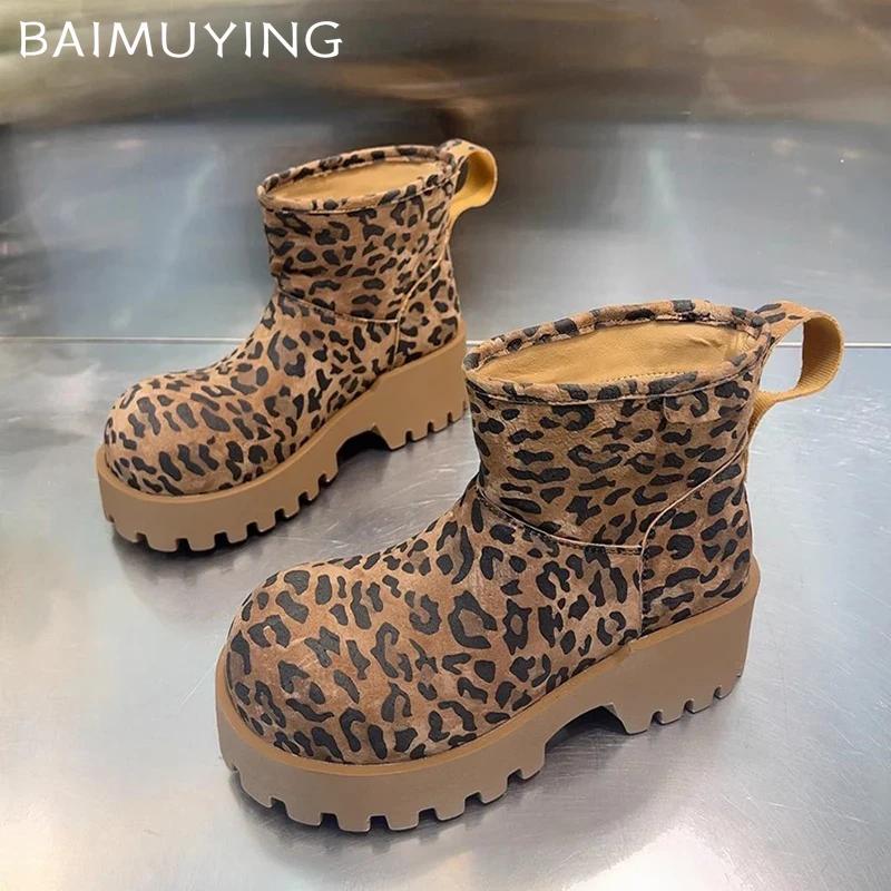 Леопардовые зимние ботильоны женские на платформе замшевые теплые туфли женские 2025 тренд зимние брендовые короткие плюшевые мотоциклетные ботинки Botas De Mujer