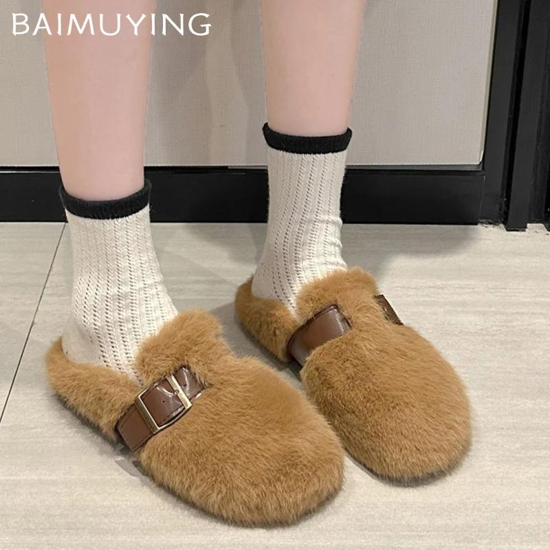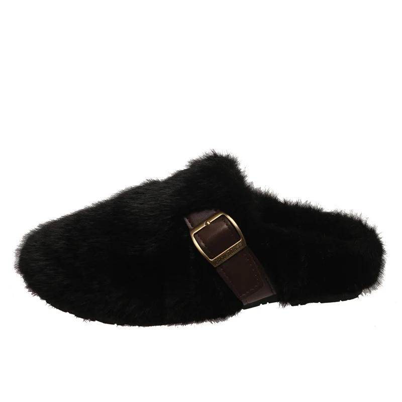 Меховые балетки женские хлопковые тапочки короткие плюшевые дизайнерские повседневные туфли с пряжкой 2025 года тренд теплые уютные домашние зимние снежные ботинки женские