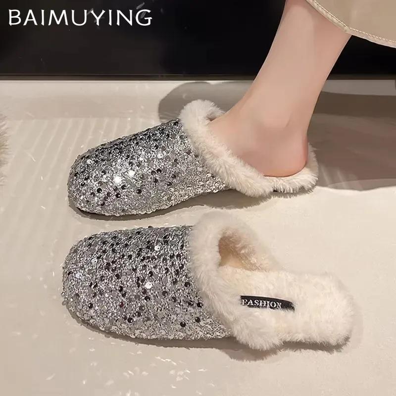 Роскошные блестящие меховые тапочки женские теплые модные туфли-мюли женские 2025 трендовые хлопковые туфли зимние туфли с открытой пяткой зимние ботинки Botas De Mujer