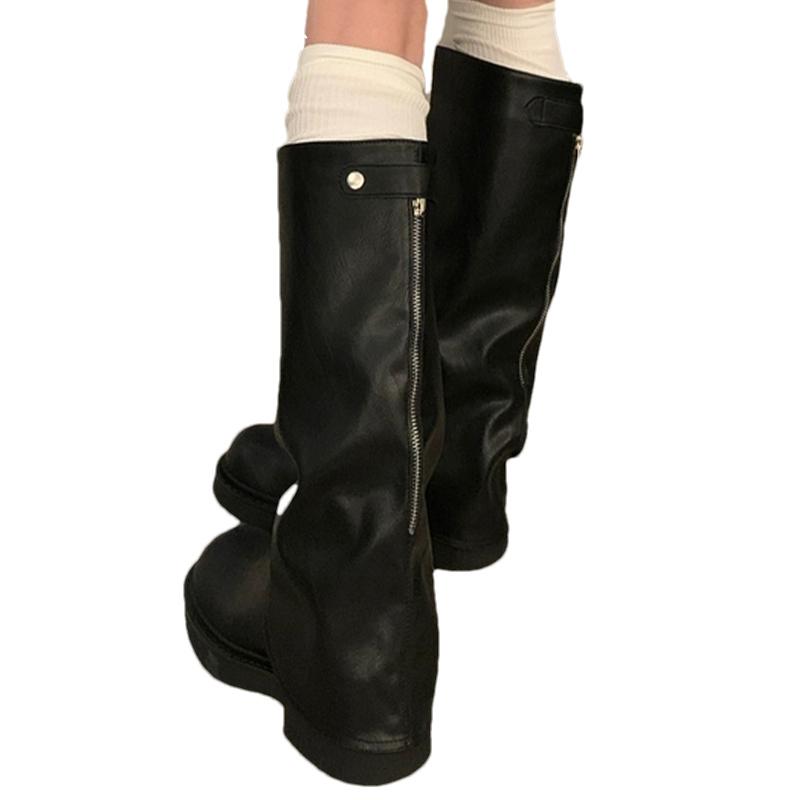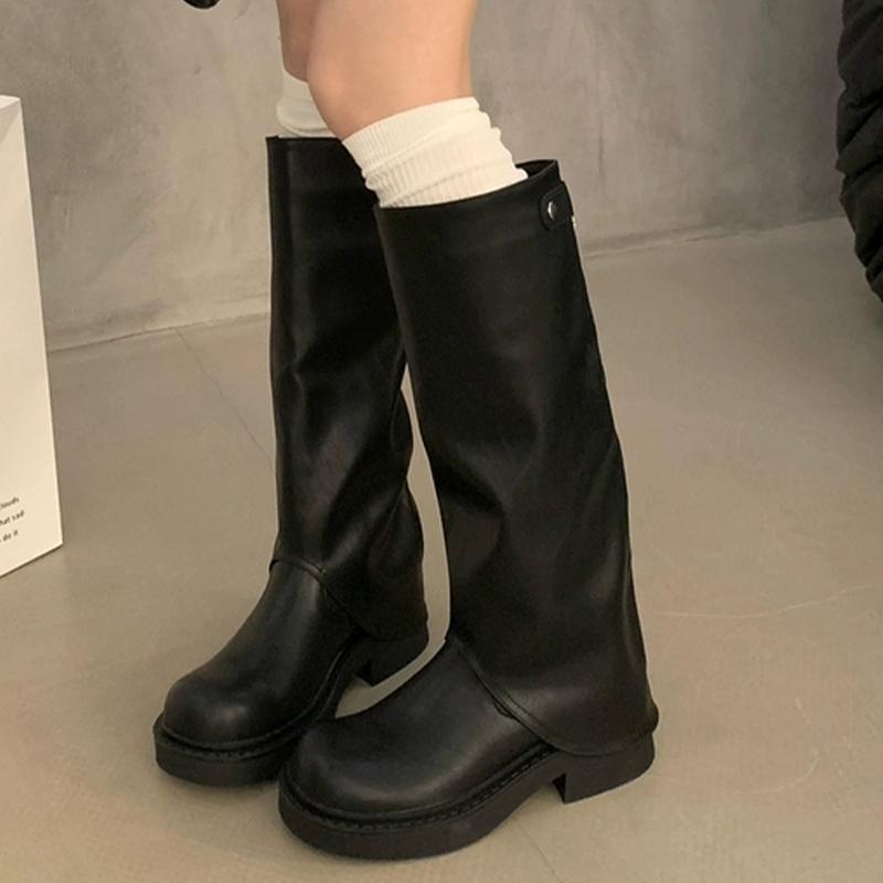 Зимние женские высокие сапоги Кожаные туфли на среднем каблуке Сапоги до колена Массивные Модные Мотоциклетные сапоги Зимний тренд 2024 Готические Botas De Mujer