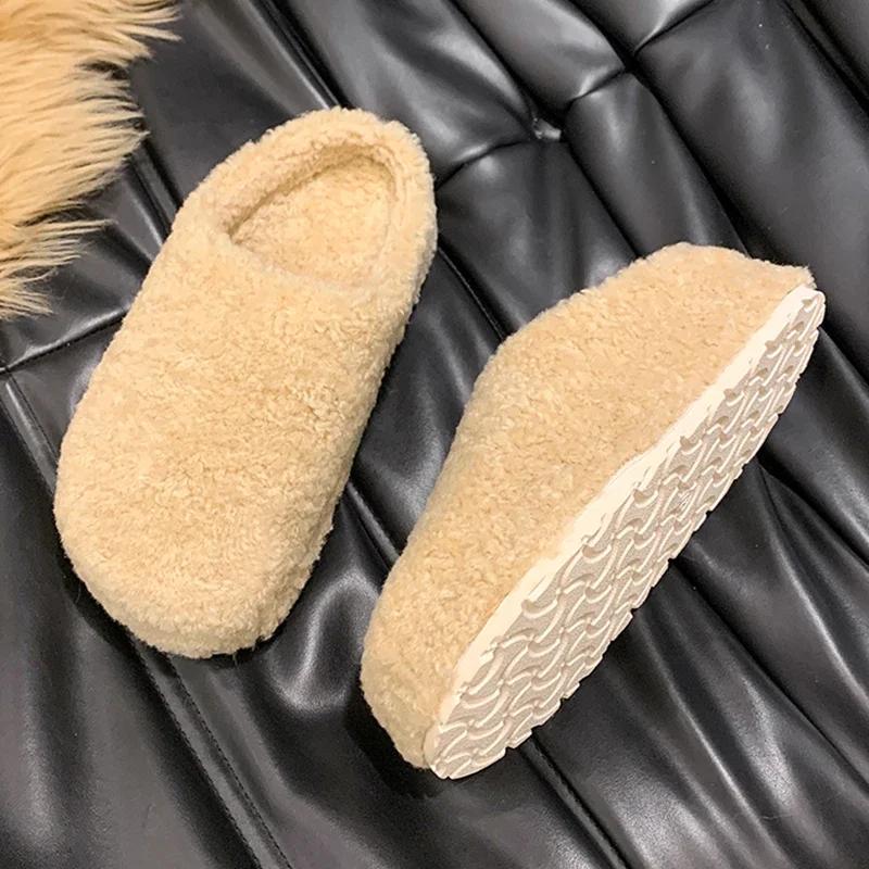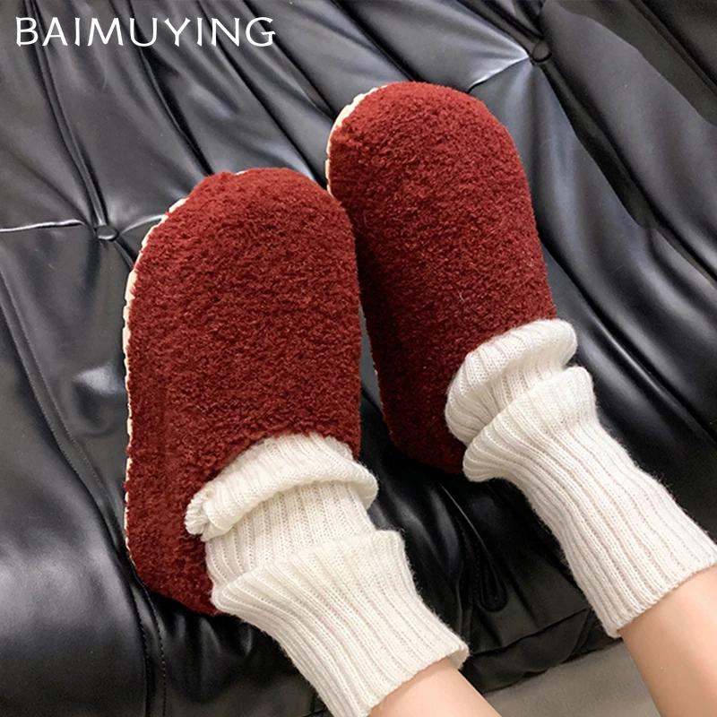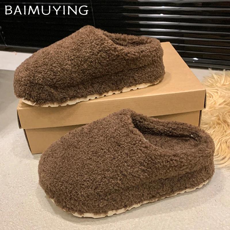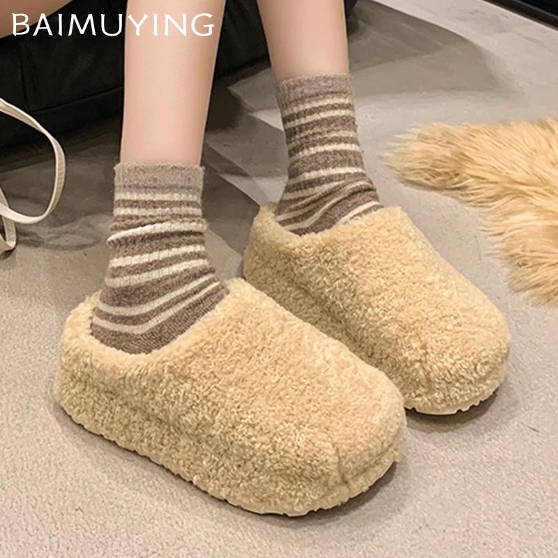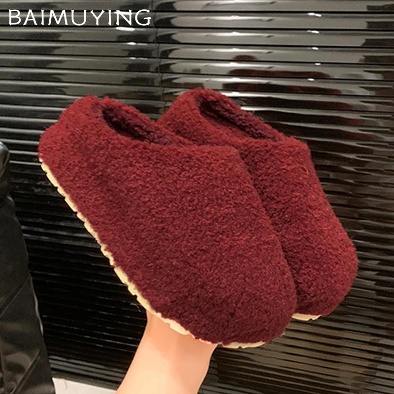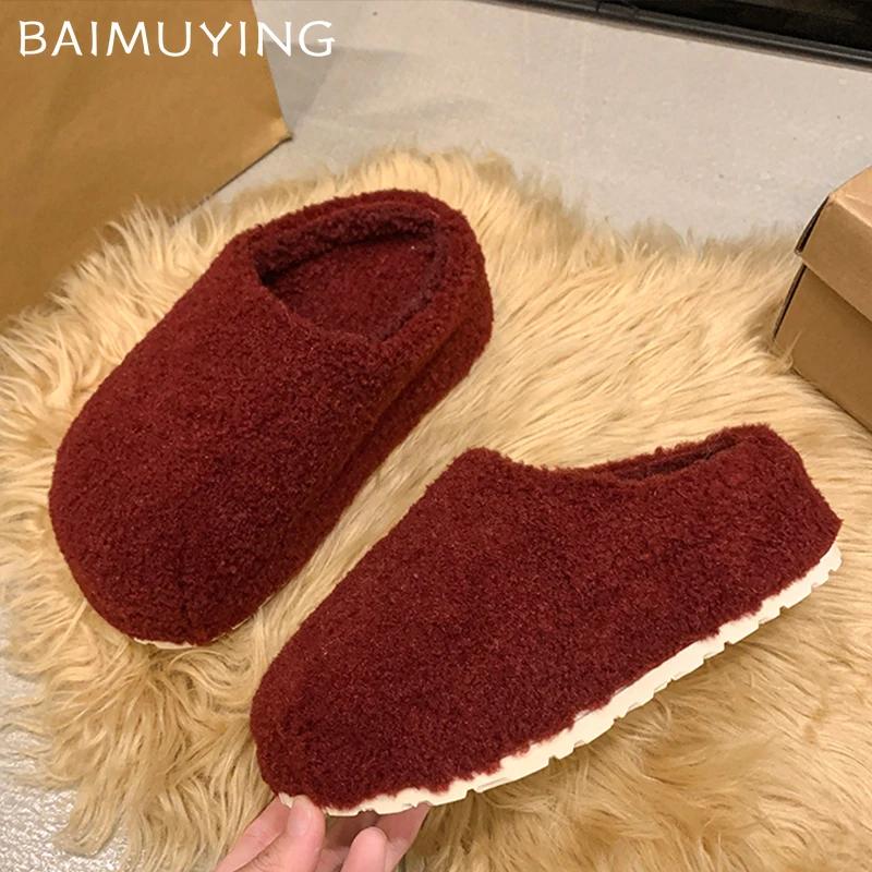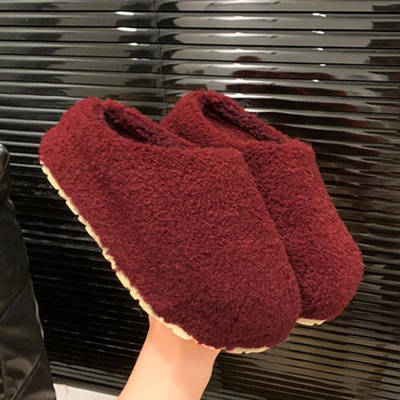 Женские тапочки на платформе с мехом, теплая хлопковая обувь, женская модная зимняя обувь 2025 года, короткая, плюшевая, уютная, домашняя подошва, винно-красного цвета, снежные тапочки для женщин