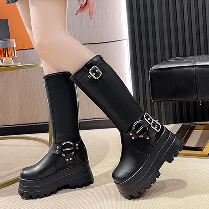 Женские высокие сапоги на платформе, модные туфли на высоком каблуке с пряжкой, 2025, трендовые кожаные зимние дизайнерские туфли до колена для мотоциклистов Botas De Mujer — купить товар онлайн с бесплатной доставкой по всему миру!