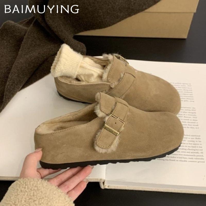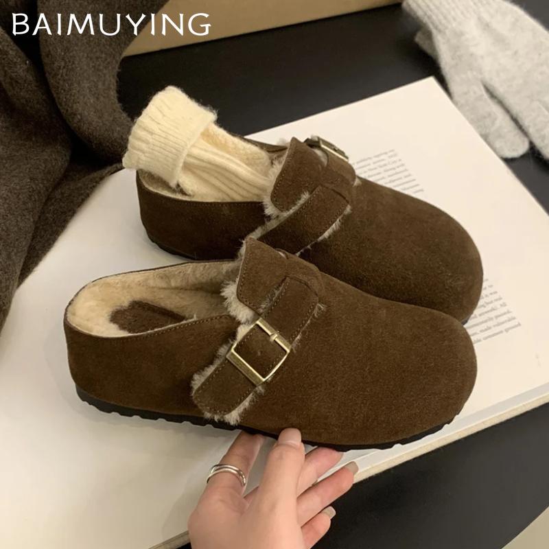 Зимние замшевые женские туфли на плоской подошве, хлопковые тапочки, короткие плюшевые дизайнерские повседневные мюли с пряжкой, тренд 2025 года, теплые домашние зимние туфли-ботинки для женщин