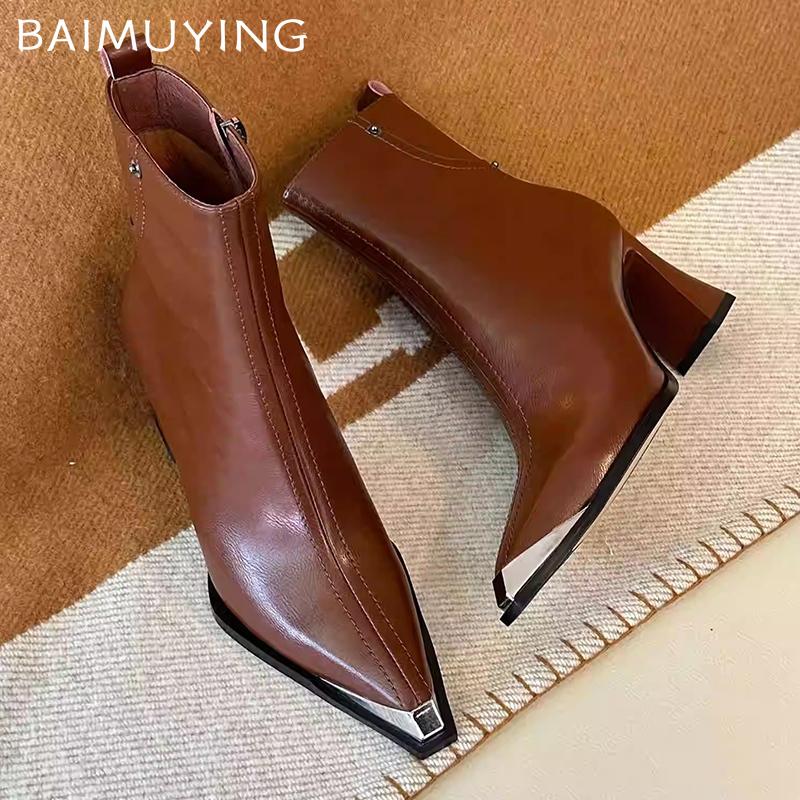 Кожаные массивные женские ботильоны с острым носком на высоком каблуке, сексуальная обувь 2025 года, модные новые туфли-лодочки, зимние туфли-челси Botas De Mujer