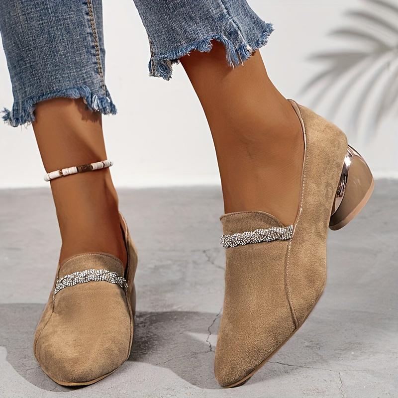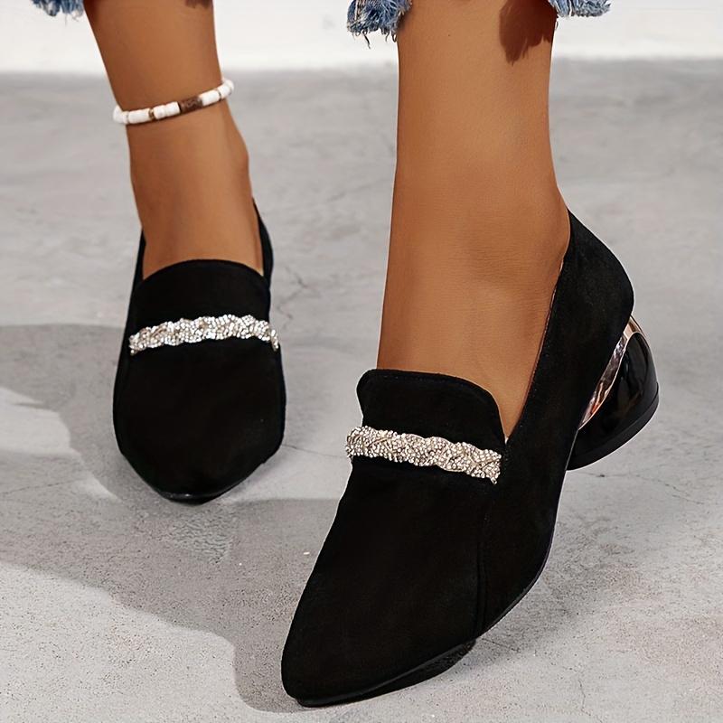 Женские лоферы с острым носком и кристаллами, повседневная обувь на среднем каблуке из массивной замши, новинка осени 2024 года, удобные туфли Zapatos Mujer