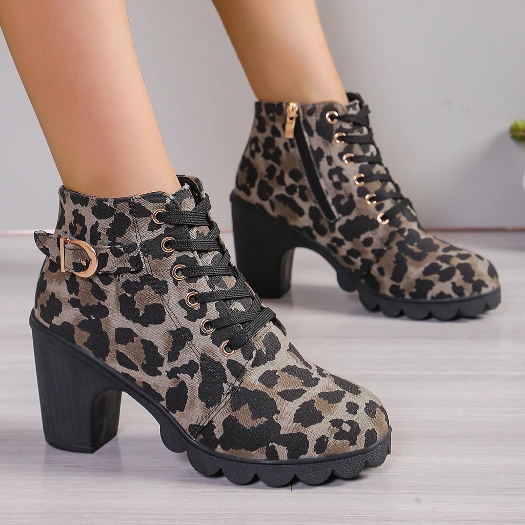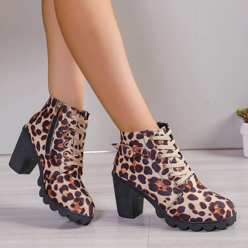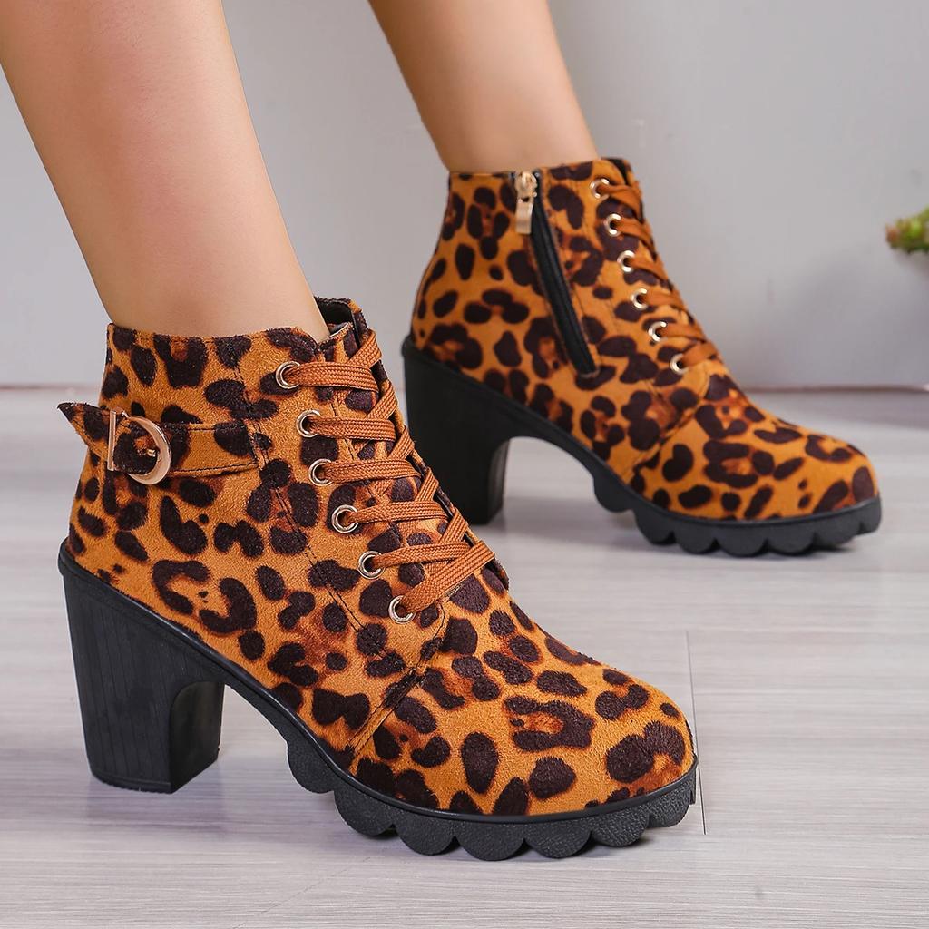 Женские ботинки с боковой молнией и леопардовым принтом 2024 года, новые теплые зимние ботинки на высоком каблуке, удобные современные ботинки на толстом каблуке для женщин