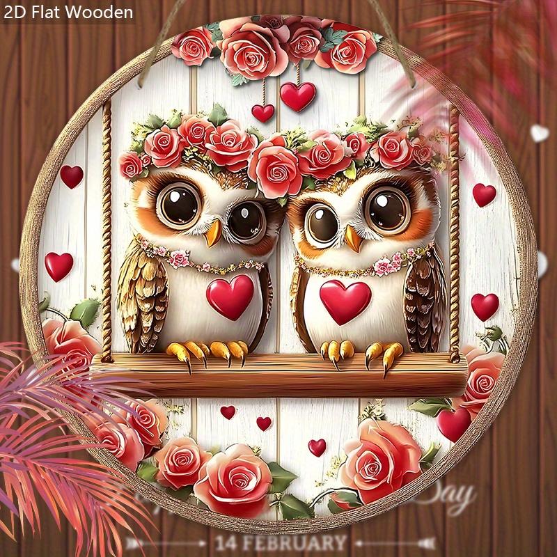 Деревянная табличка на День святого Валентина с очаровательной парой сов и узором из роз, круглая табличка для декора на стену или входную дверь, идеальный подарок на День святого Валентина