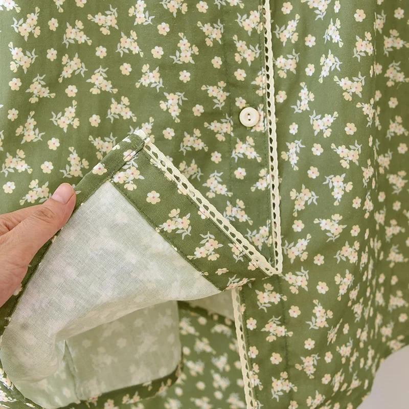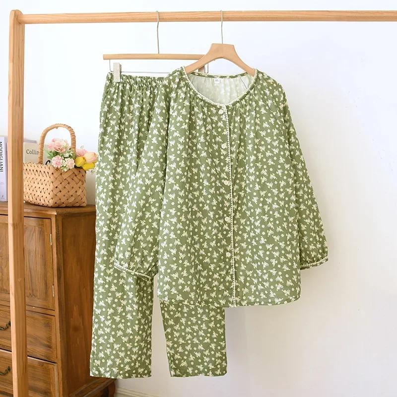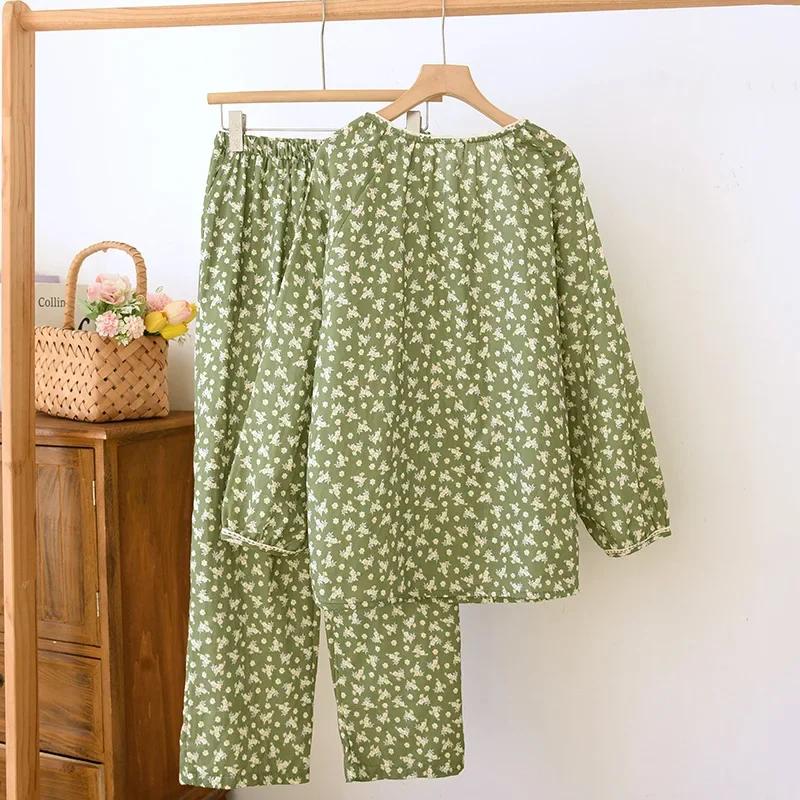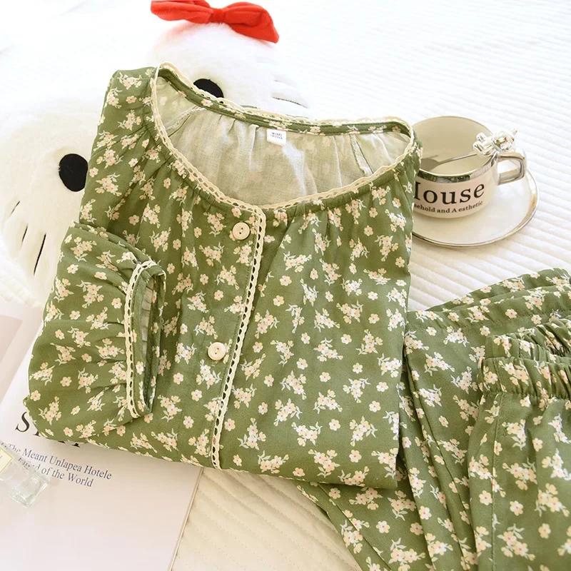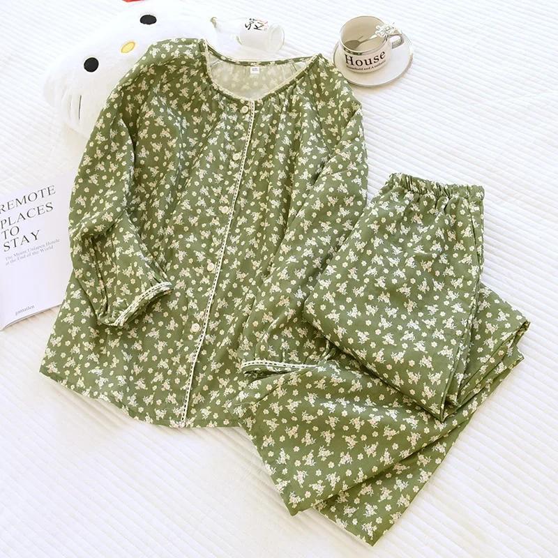 2026 Японский Новый Женский Весенне-Летний Комплект Пижамы из Двух Предметов 100% Хлопок Круглый Вырез Кардиган Длинный Рукав Брюки Комплект Домашней Одежды