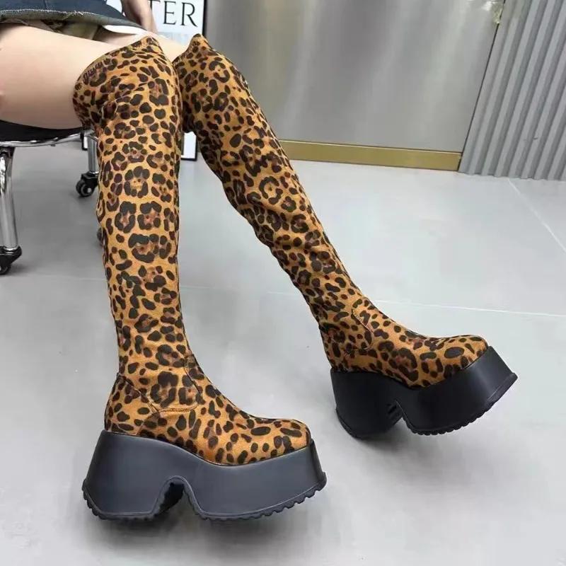 Леопардовые женские высокие сапоги на платформе из замши на высоком каблуке, женские брендовые зимние трендовые сексуальные массивные ботинки Mujer 2025 года