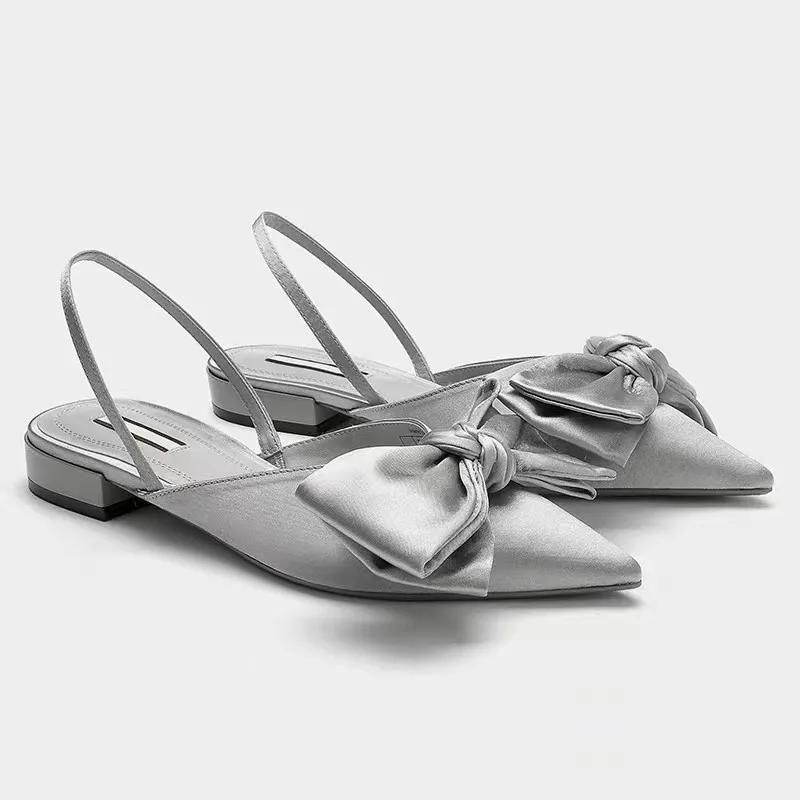 2024 Модная женская обувь с одной педалью, женские туфли-лодочки, летние туфли с острым носком и бантом, сексуальные туфли для вечеринок, женские туфли на низком толстом каблуке