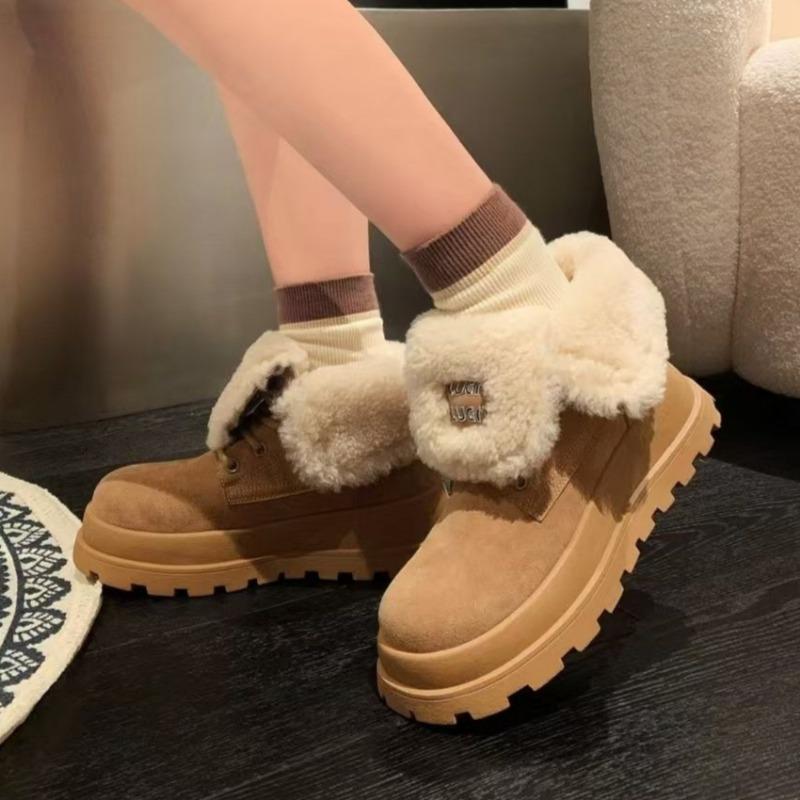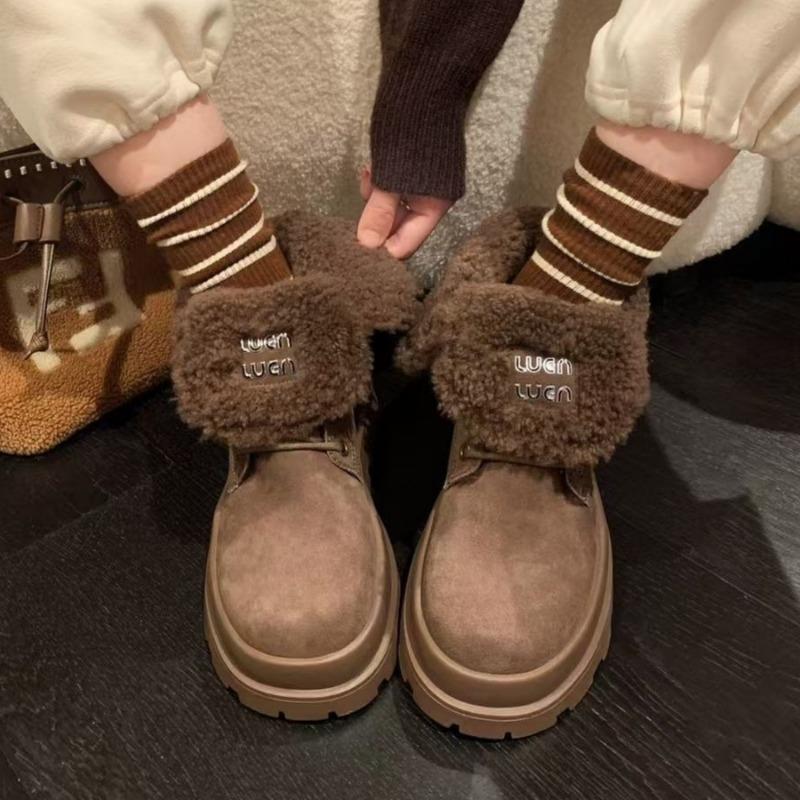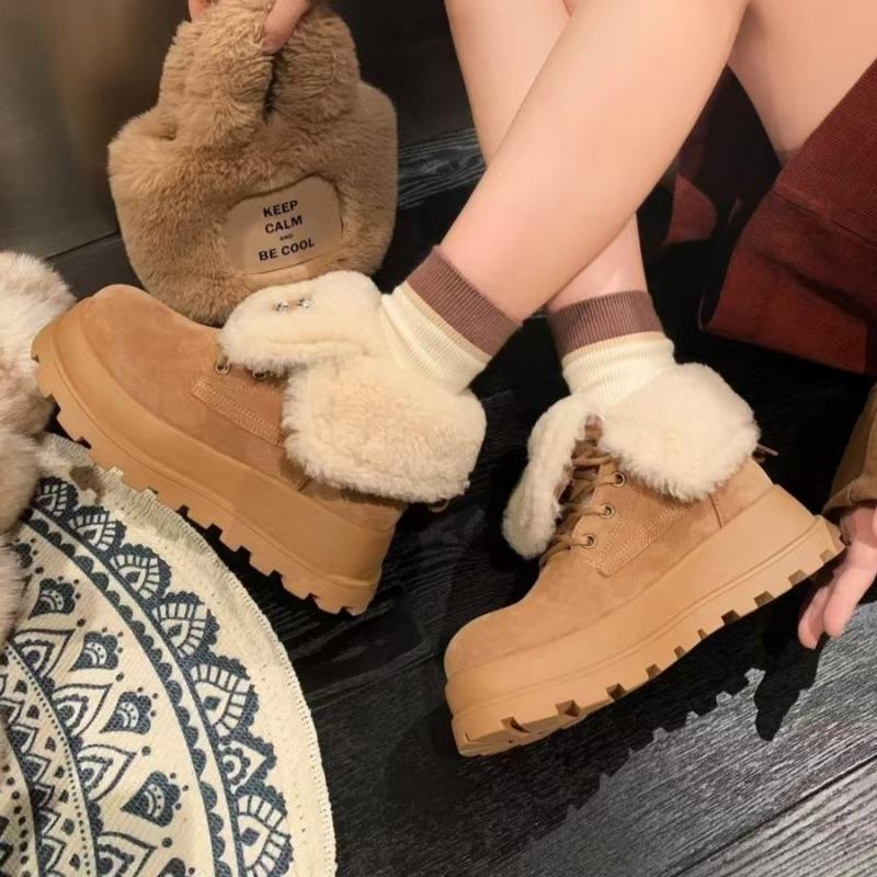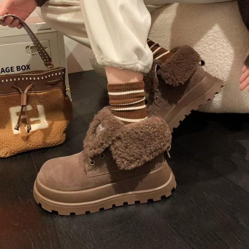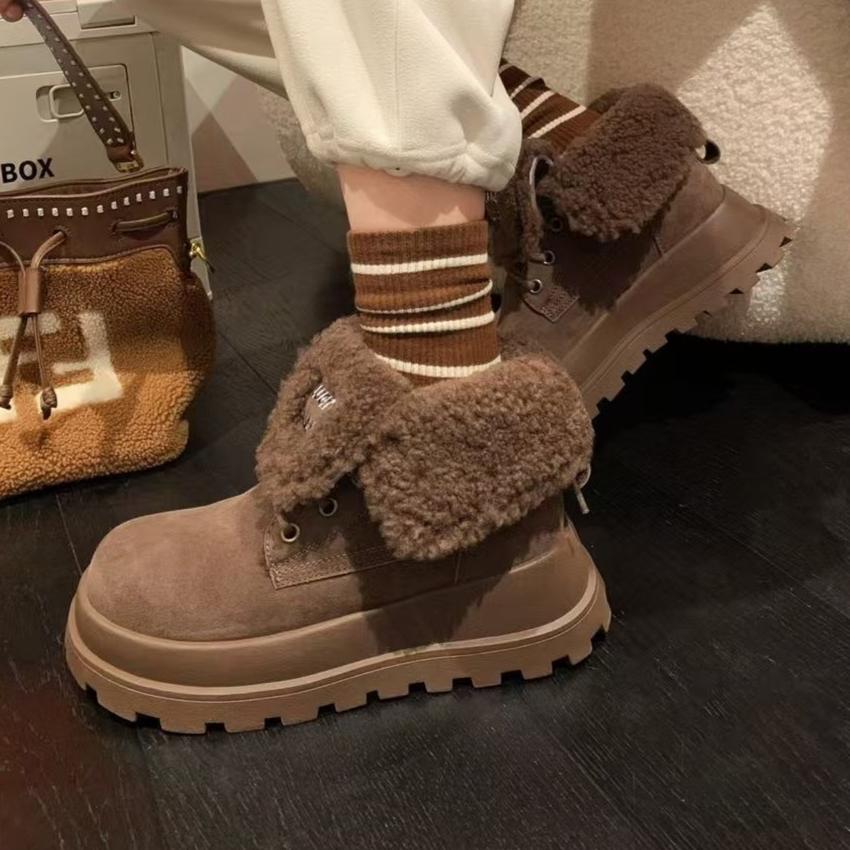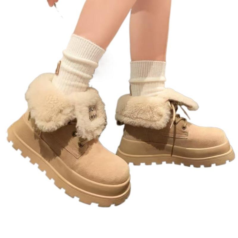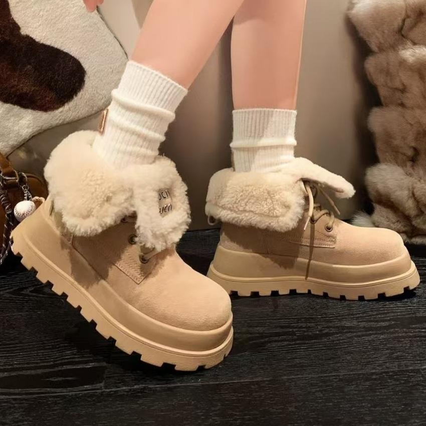 Ботинки женские на меховой платформе из замши на плоской подошве, теплые, плюшевые, повседневные, зимние, 2025, спортивные, нескользящие, на шнуровке, женские ботинки