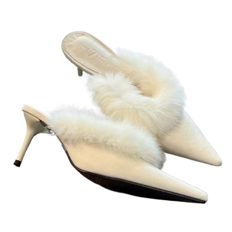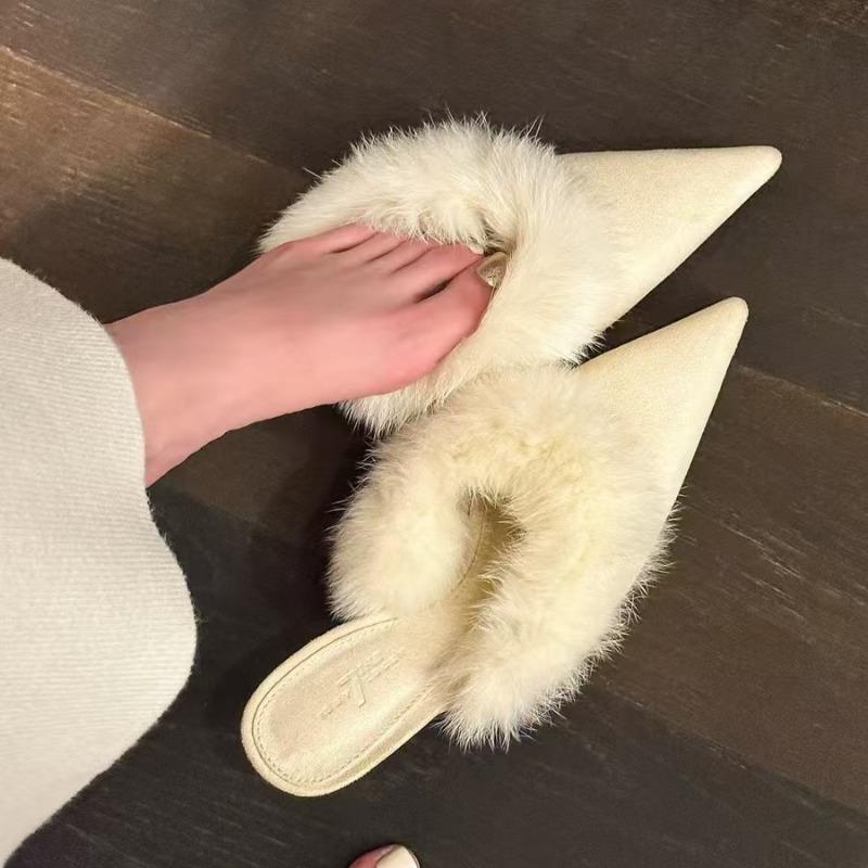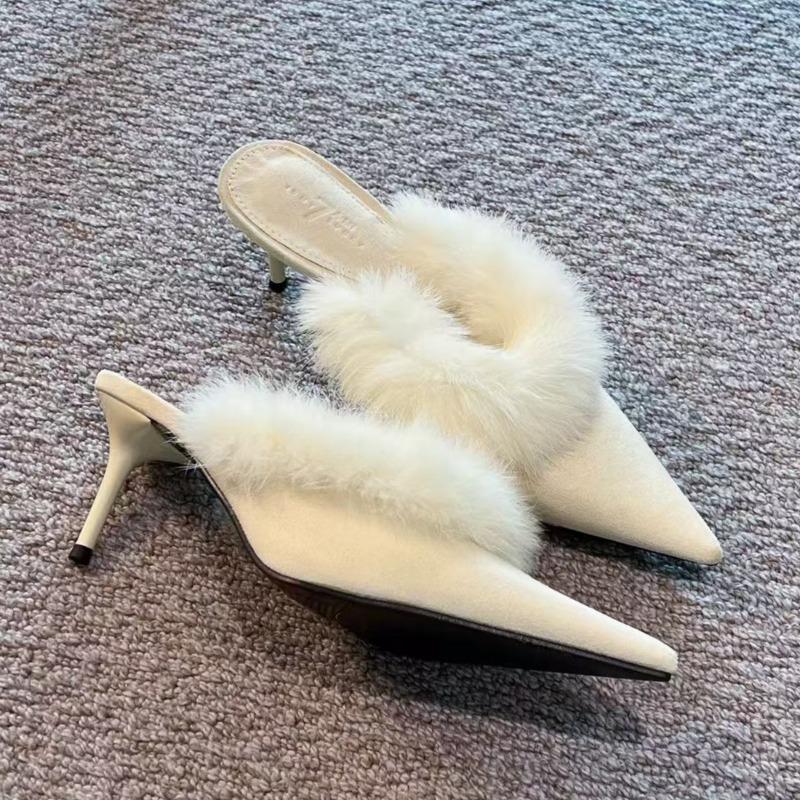 Меховые женские тапочки с острым носком, сексуальные замшевые шлепанцы на высоком каблуке, зимняя обувь 2025 года, тренд, элегантная вечеринка, Zapatos Mujer