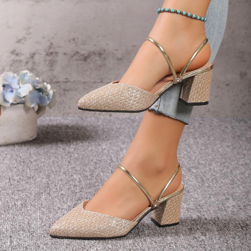 Золотые серебряные туфли-лодочки на высоком каблуке, женские модные туфли с ремешком сзади, женские туфли с острым носком и открытой пяткой на толстом каблуке