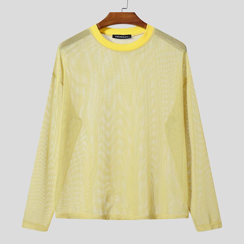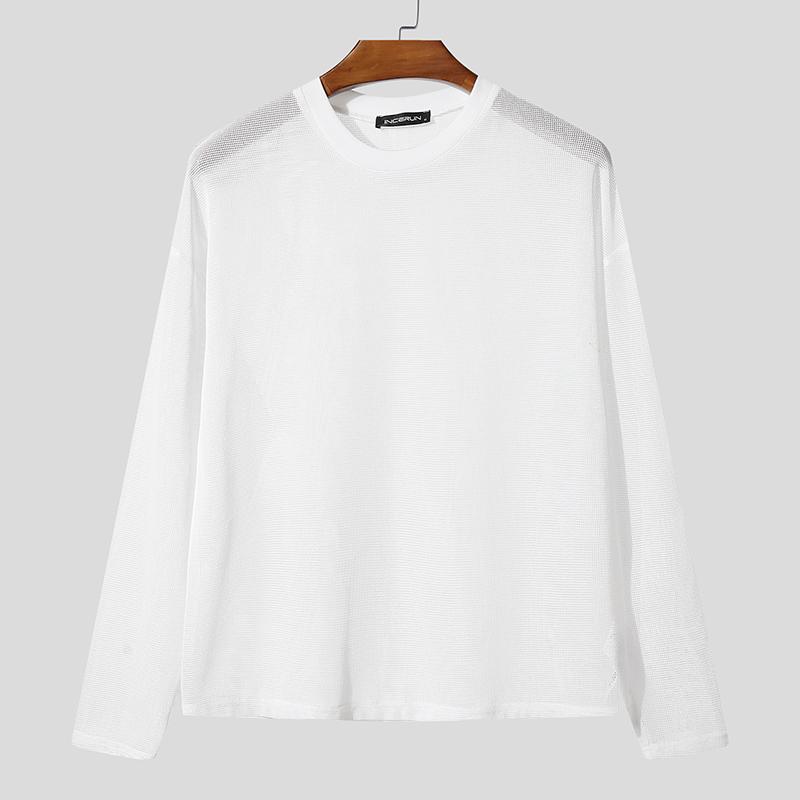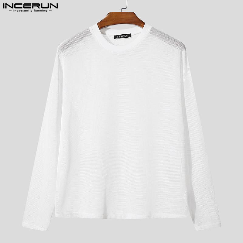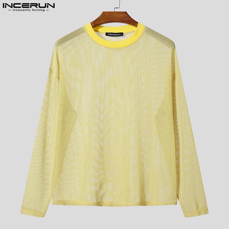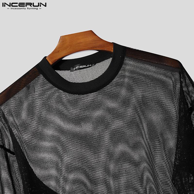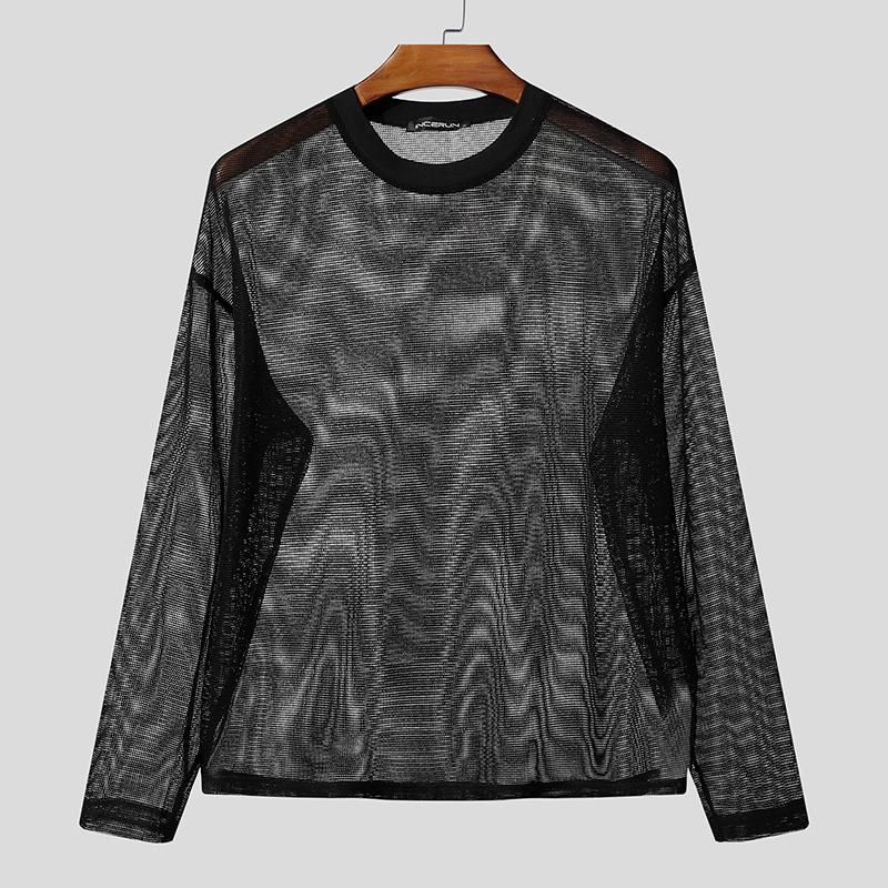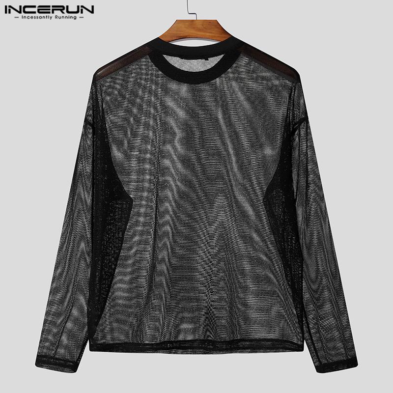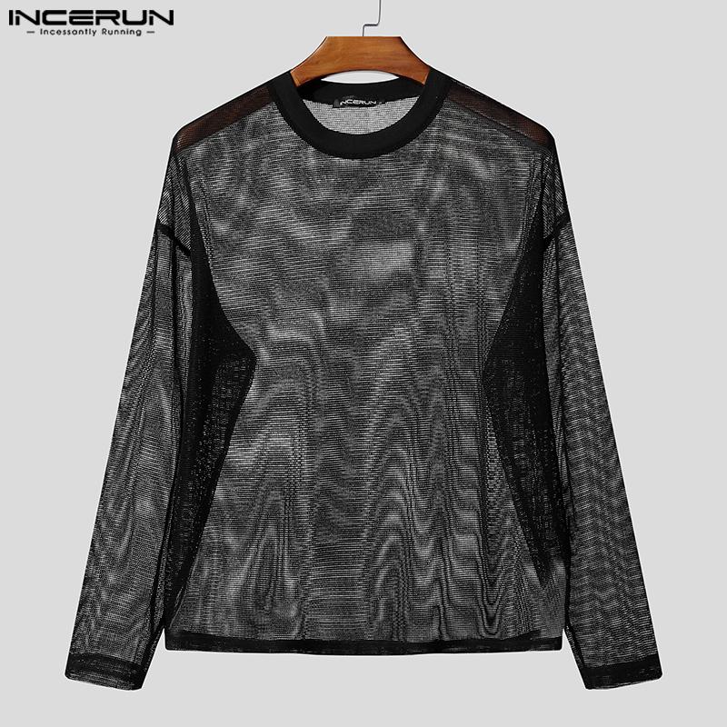INCERUN Мужские футболки с длинным рукавом и круглым вырезом, прозрачные повседневные топы из сетки с вырезами