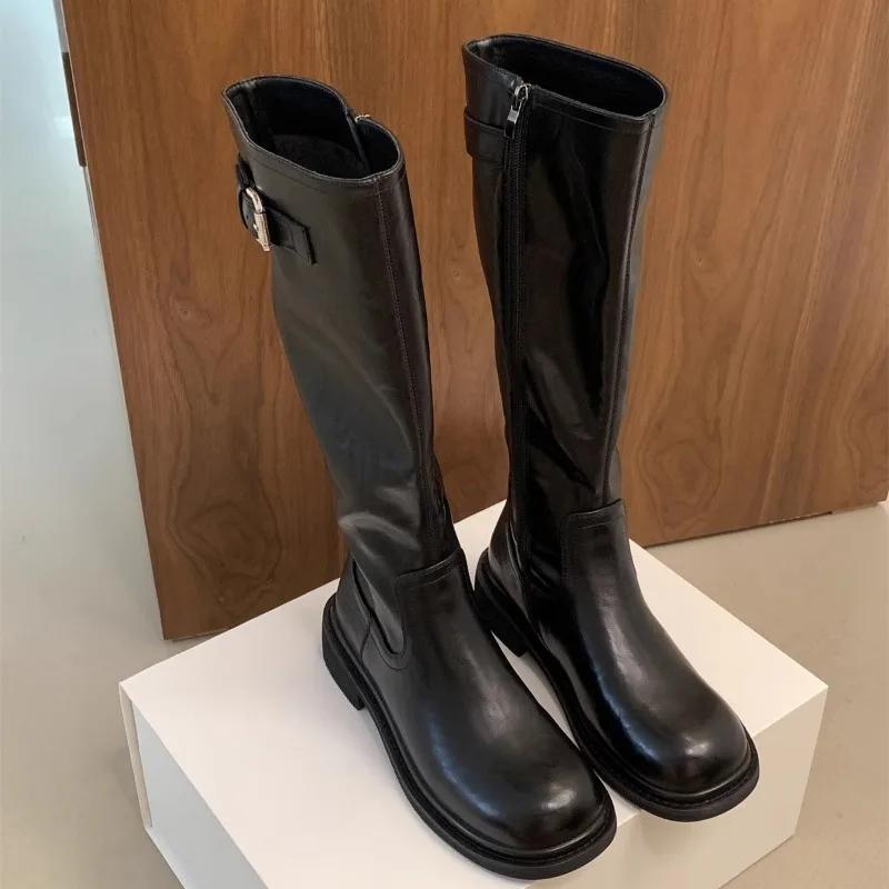 Современные ботинки до середины голени на квадратном каблуке, зимняя женская обувь с круглым носком, распродажа 2024 года, лаконичные женские ботинки на низком каблуке с пряжкой на ремне