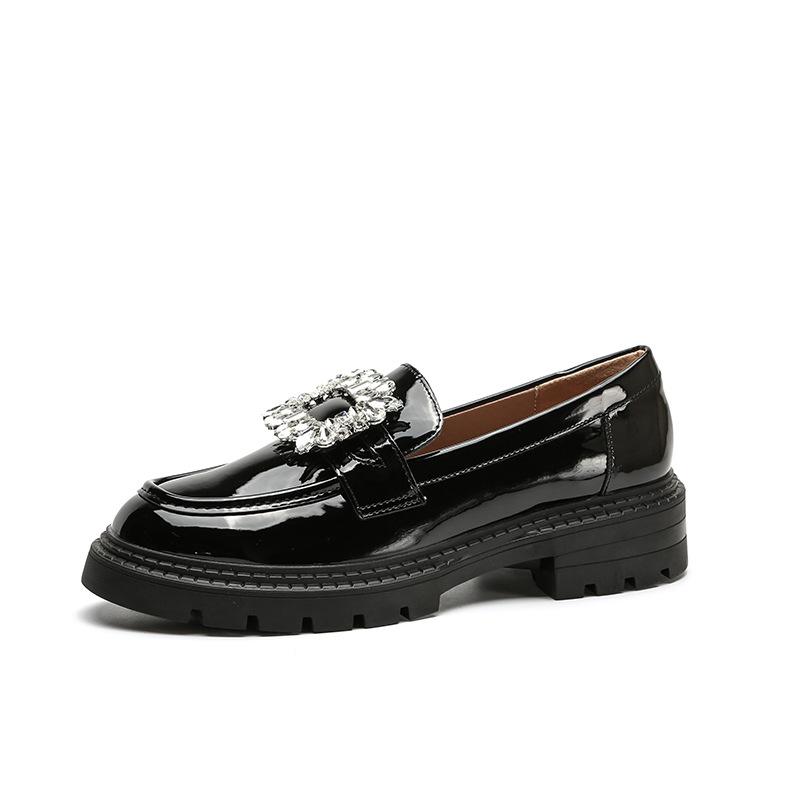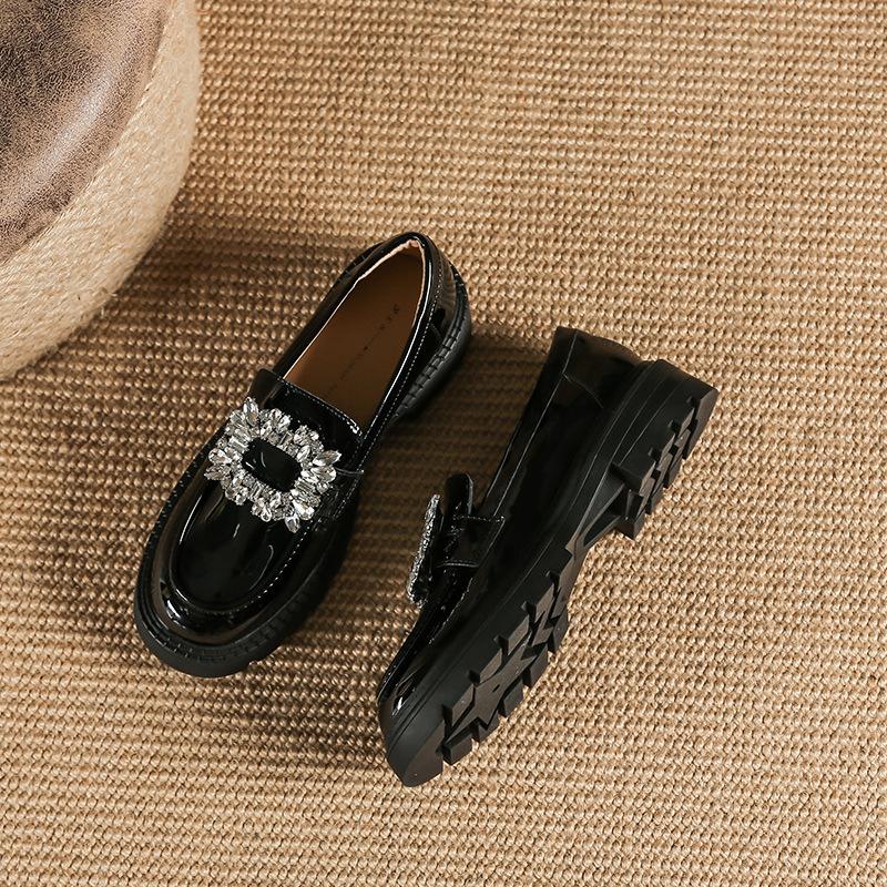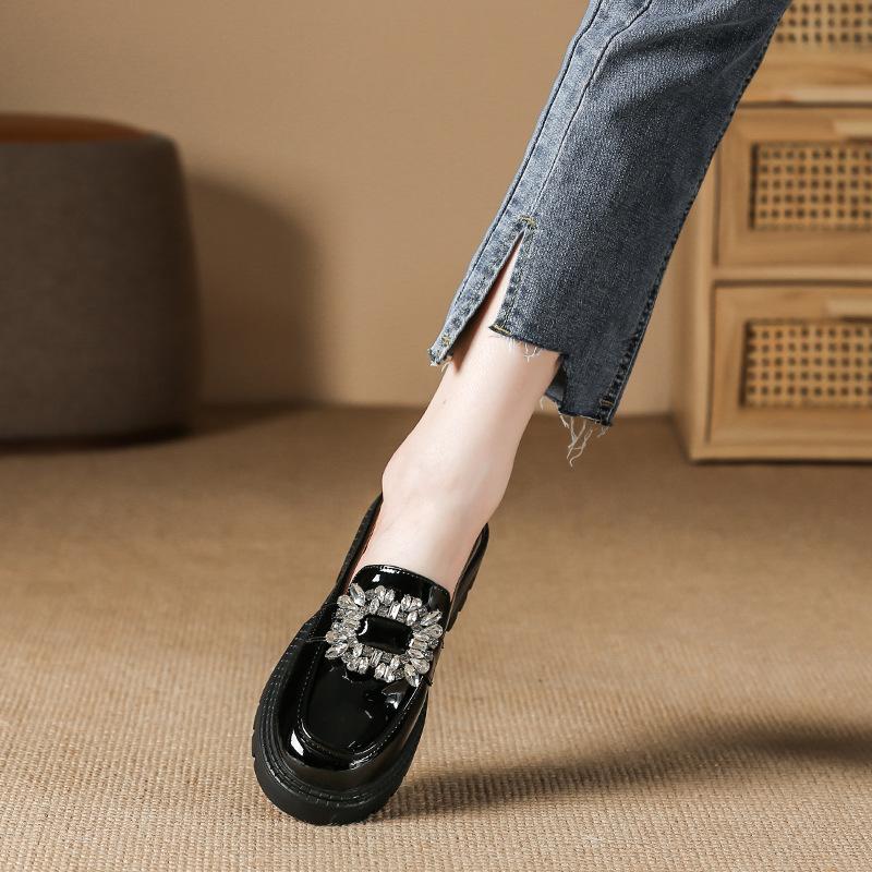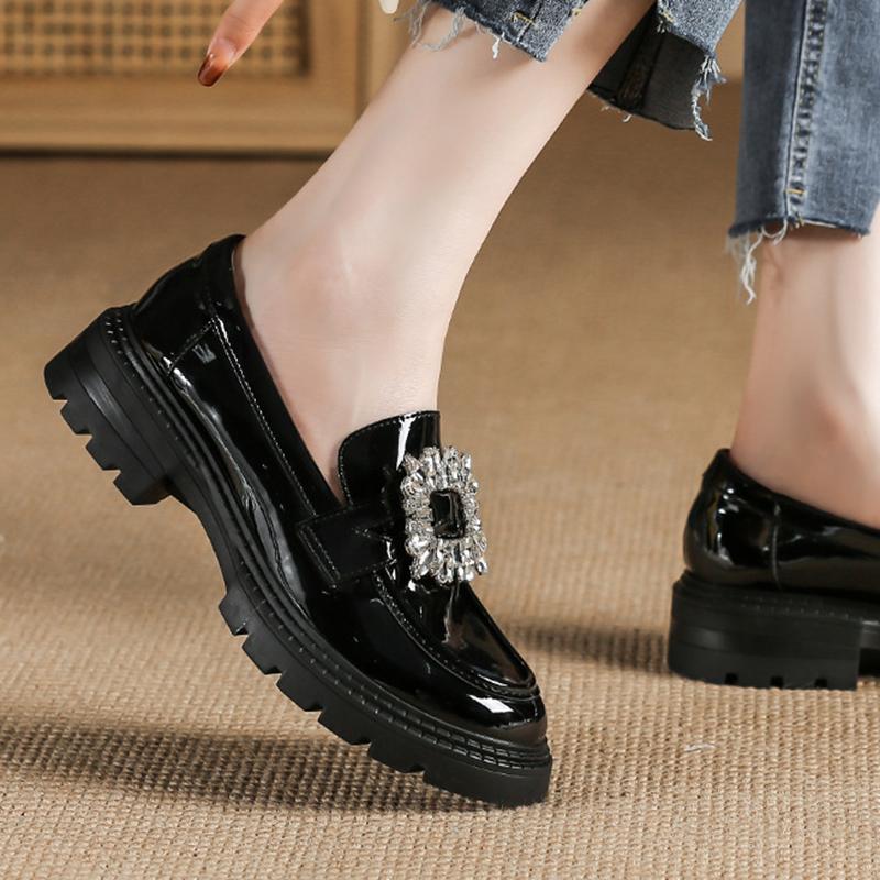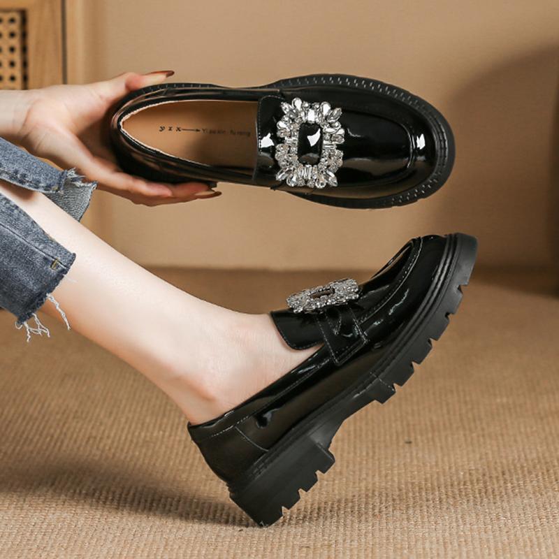 Maogu Ladies 2024 Кожаные оксфорды на плоской подошве с утолщенной подошвой Женские повседневные туфли-лоферы без застежек Туфли в стиле Лолиты со стразами и пряжкой на низком каблуке