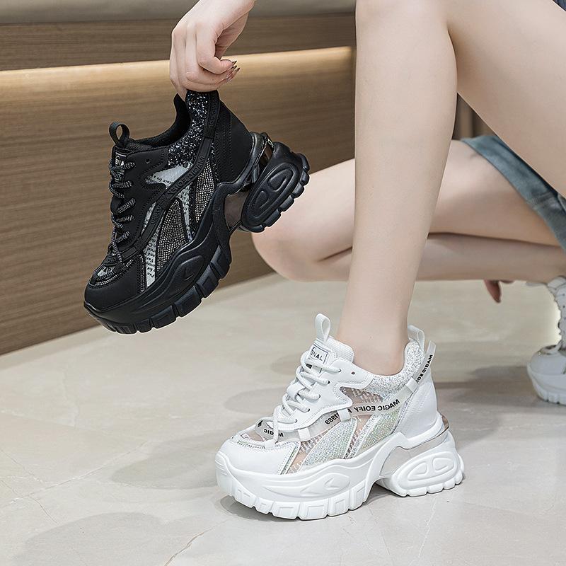 Летние дышащие сетчатые туфли на толстой подошве с увеличением высоты на 9 см, со стразами, для повседневной носки и занятий спортом, с увеличением высоты каблука, женская обувь