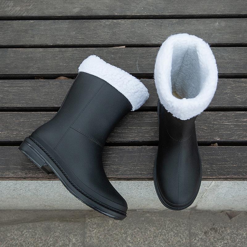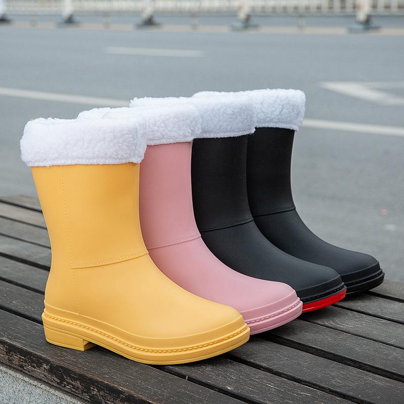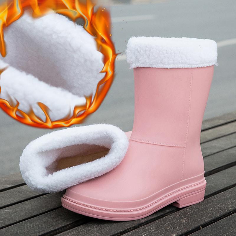 Новые женские теплые резиновые сапоги, модная водонепроницаемая обувь, водонепроницаемые зимние ботильоны, резиновые сапоги средней высоты, однотонные ботильоны
