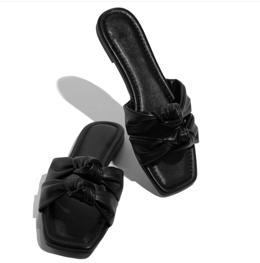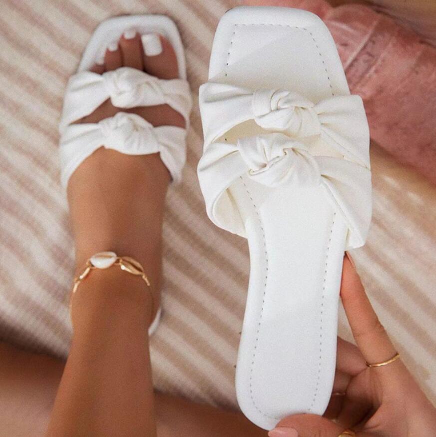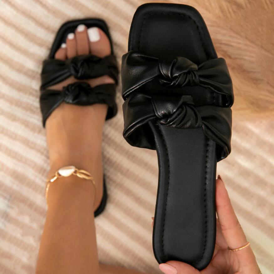 2024 Новые женские тапочки Летние туфли с бантом и квадратным носком Женские сандалии на плоской подошве с перекрученным ремешком Для отдыха на пляже Повседневные удобные женские шлепанцы
