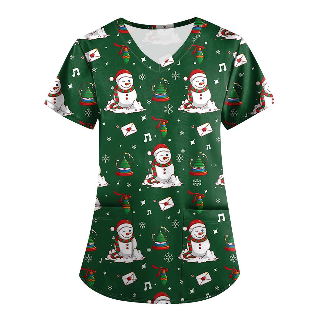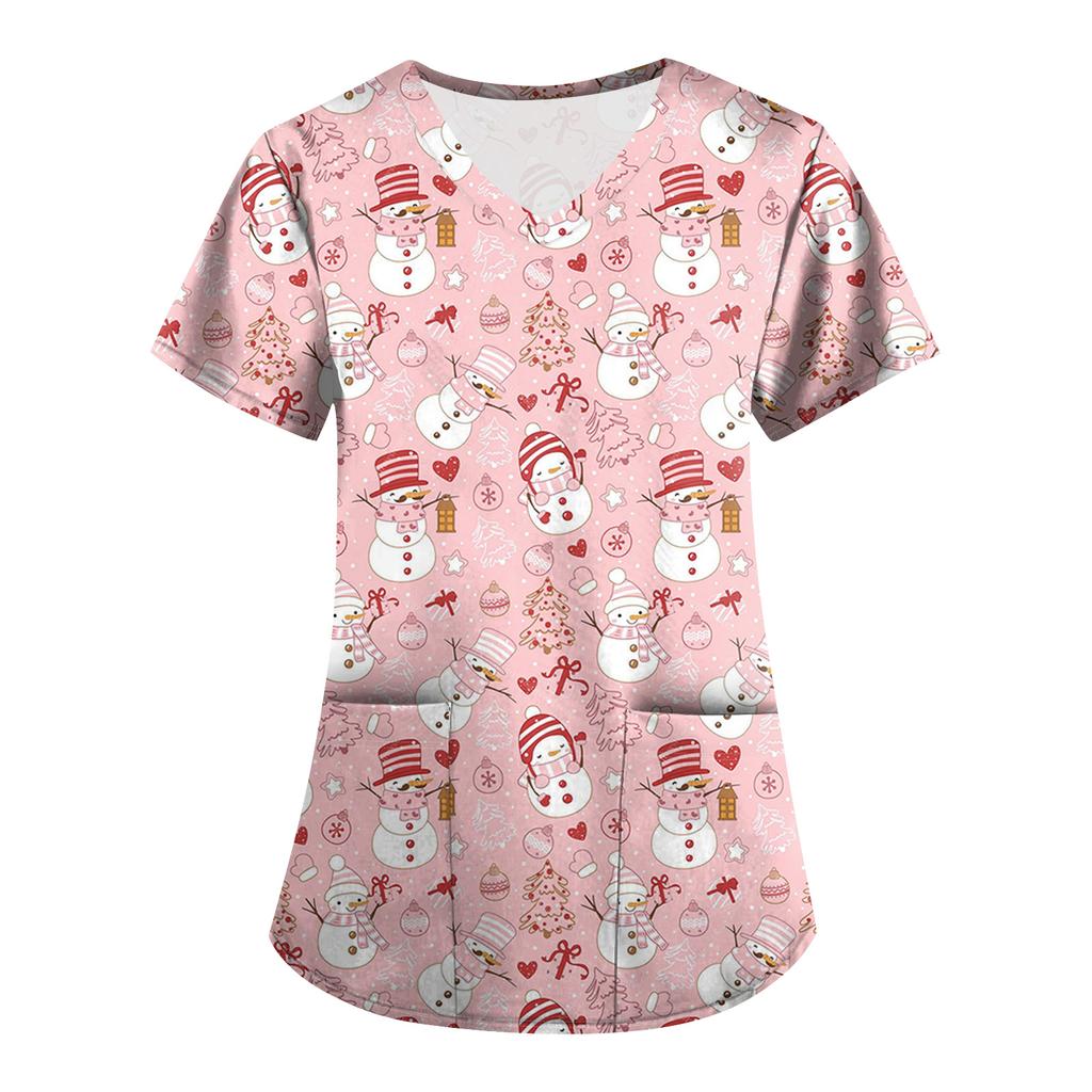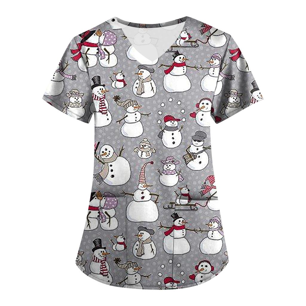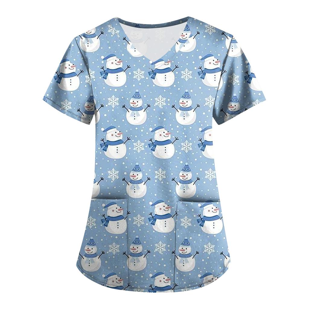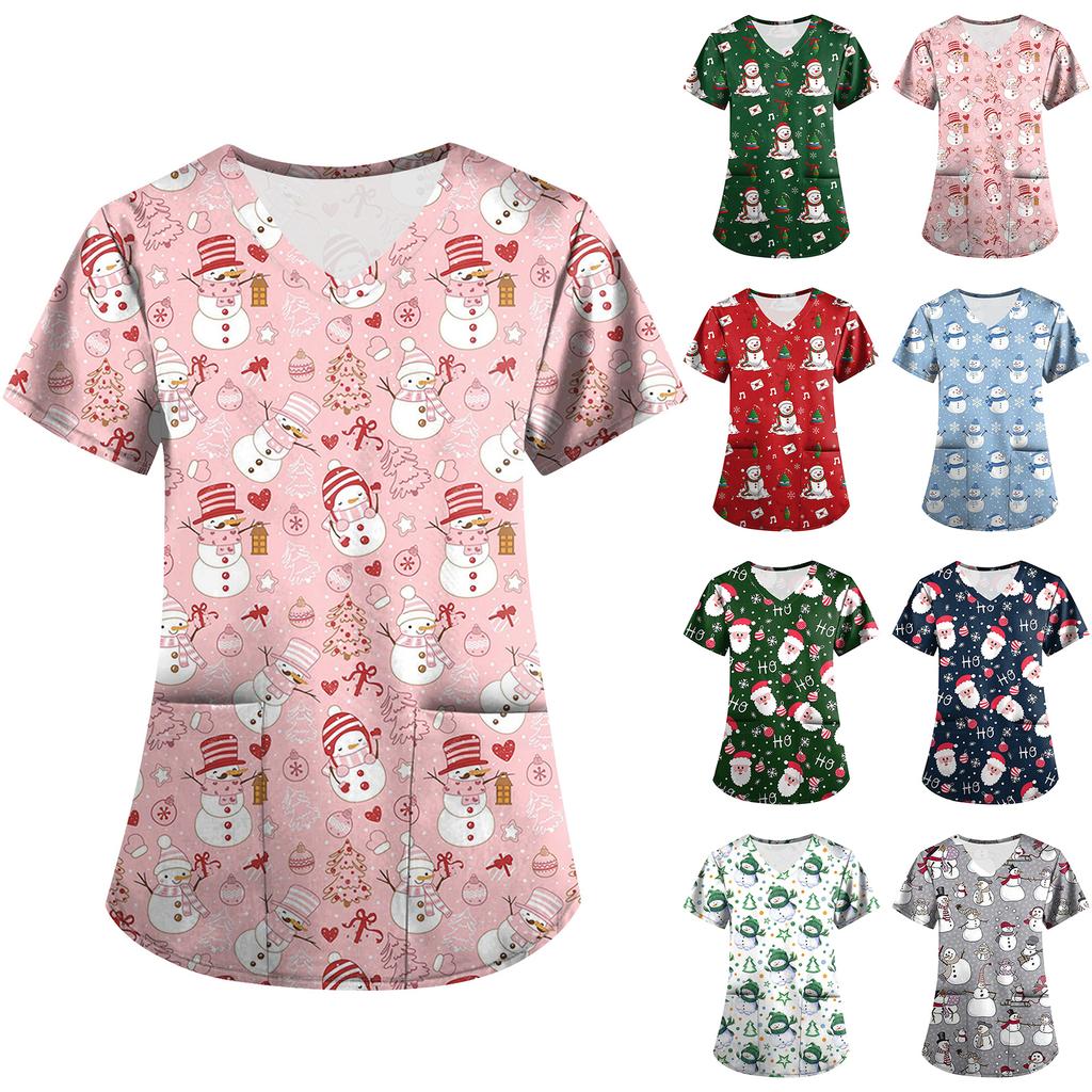 Большой размер Принтованный скраб Рабочая униформа Топы для женских V-образный вырез с запахом Принт Короткий рукав Веселые футболки Рабочая одежда Футболка с карманами