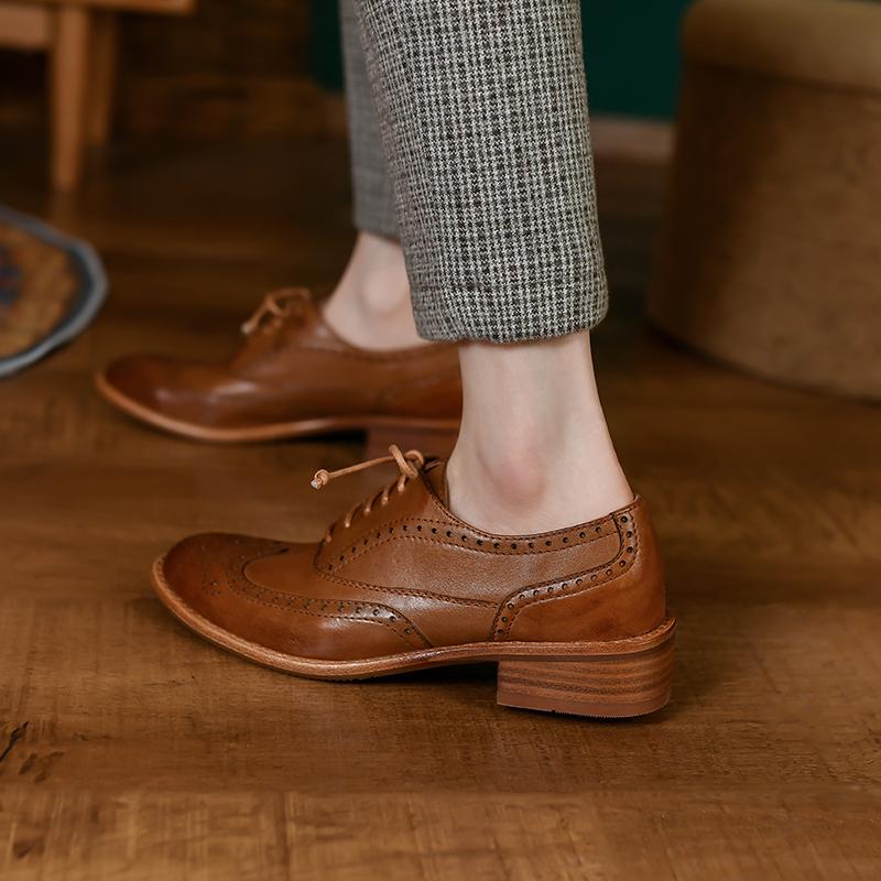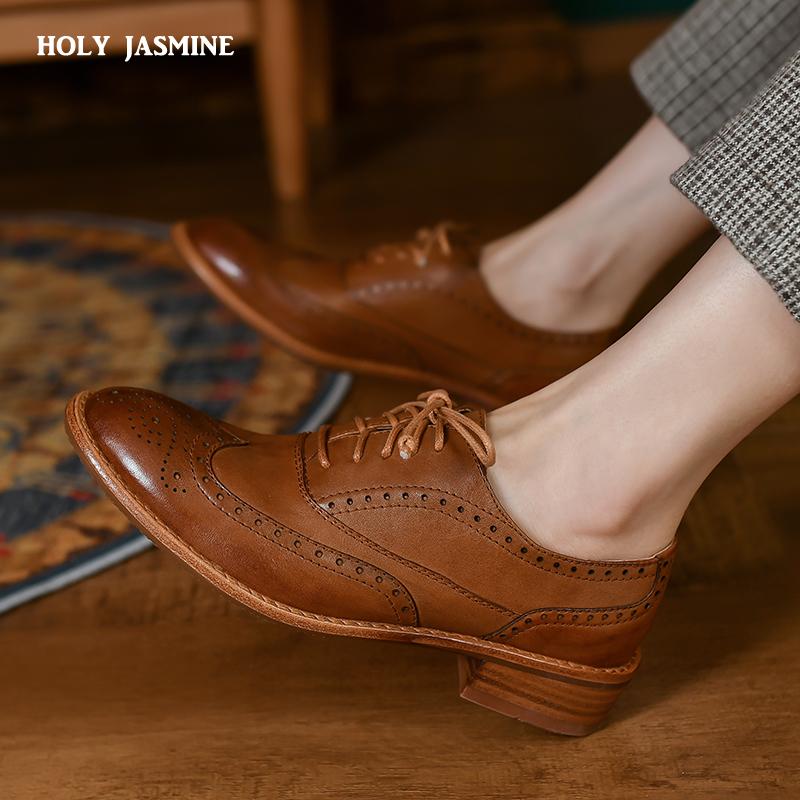 Туфли-броги на шнуровке для женщин Винтажные оксфорды на плоской подошве Женские туфли на плоской подошве из коровьей кожи Женские туфли-оксфорды на низком каблуке в стиле ретро с британским качеством