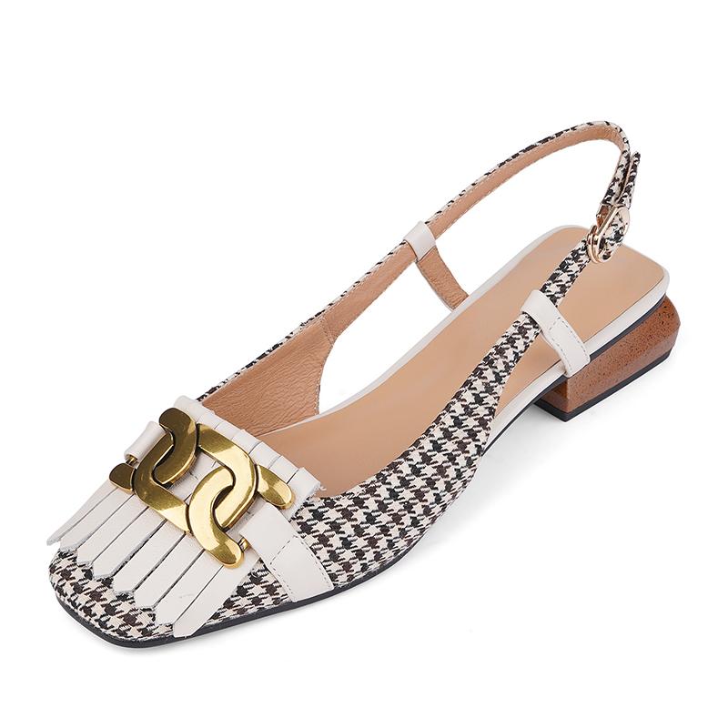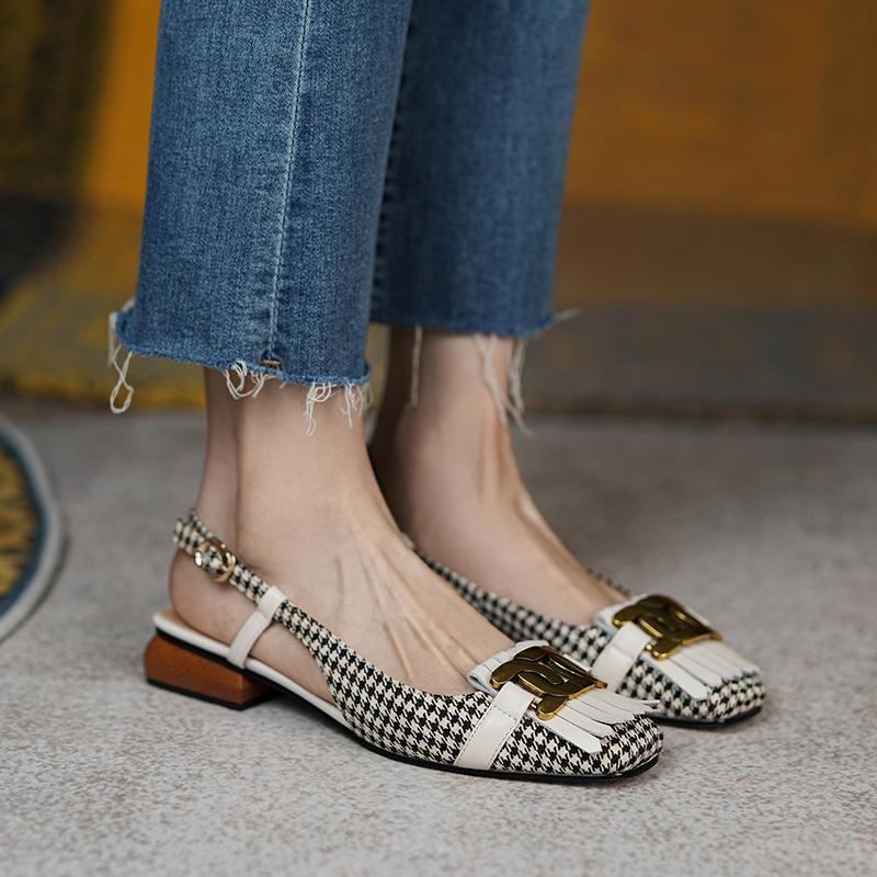 2024 Новые женские летние модные босоножки в стиле ретро на низком каблуке с квадратным носком из кожи с полым тонким каблуком Baotou с металлическим украшением