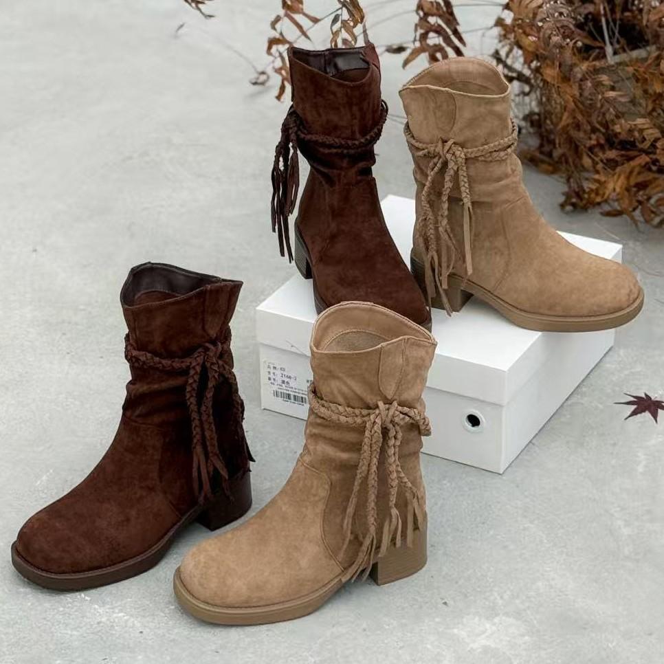 Осень и зима новая ретро бахрома толстый каблук короткие сапоги замша круглый носок сапоги на наборном каблуке средний каблук женские сапоги