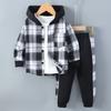 Детская одежда Осень/Зима Комплект из двух предметов для мальчиков: клетчатая толстовка с капюшоном контрастной расцветки и брюки с длинными рукавами (Топ + Брюки)