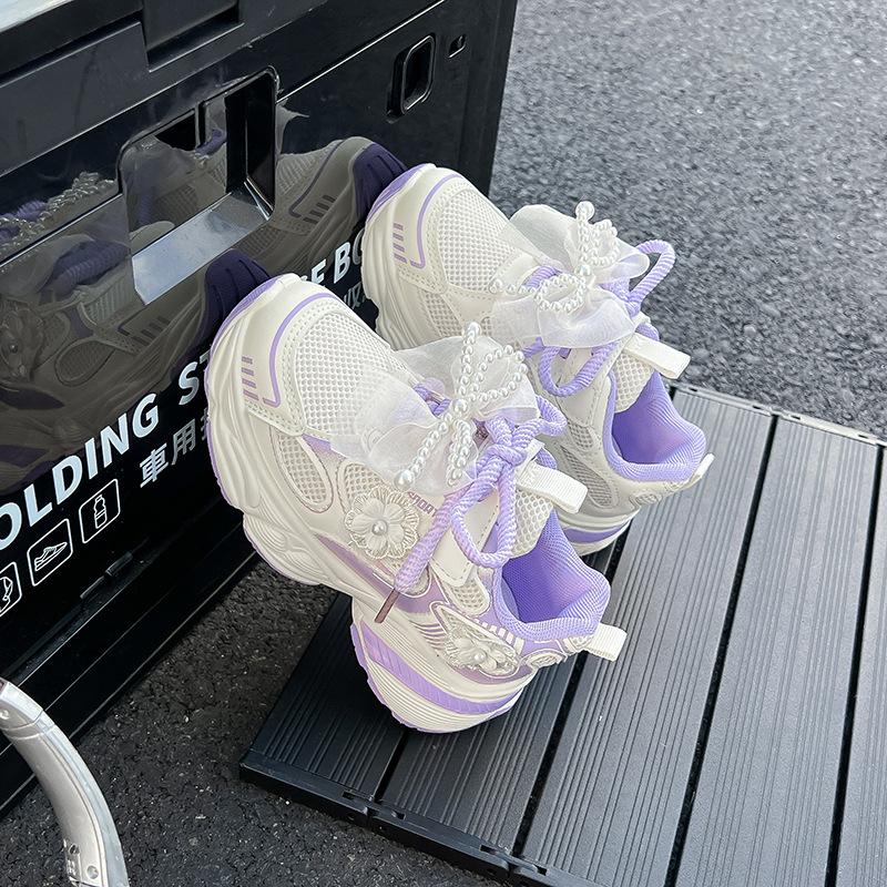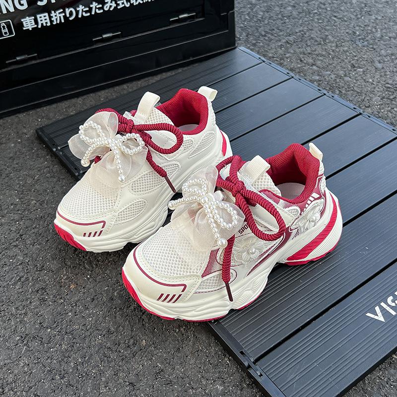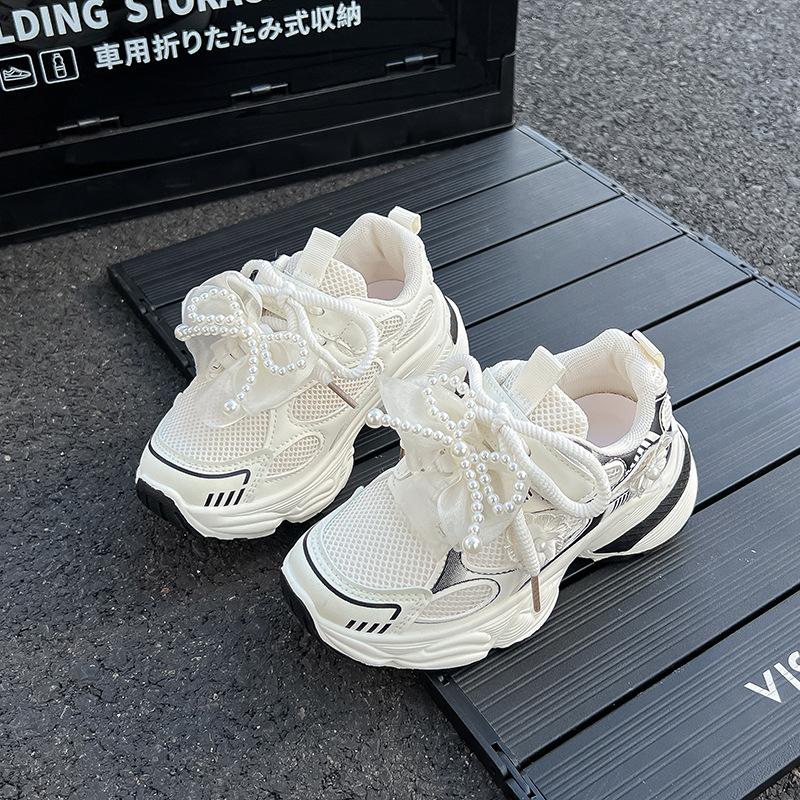 Девочки жемчужные кроссовки дышащие бант папины кроссовки 2025 весна и осень новые девочки беговые принцесса белые туфли