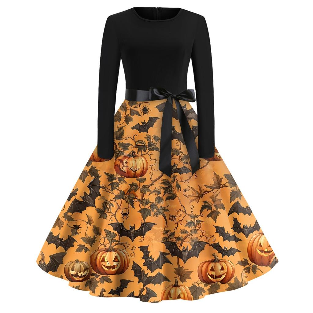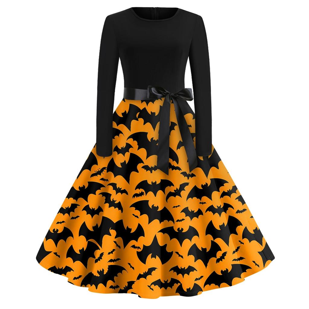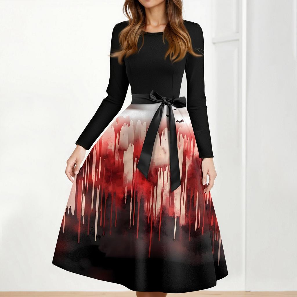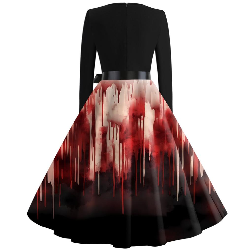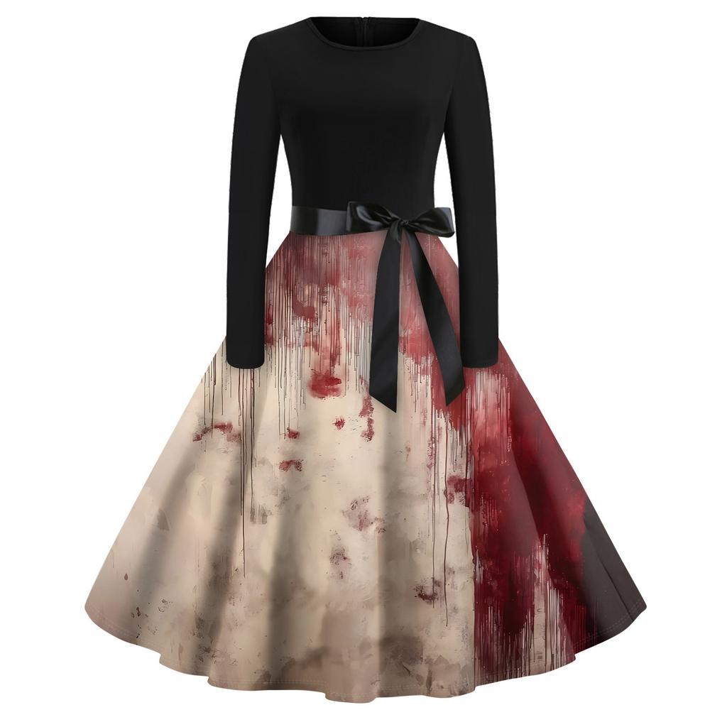 Платье-клеш с принтом на Хэллоуин для женщин с длинным рукавом, повседневные платья с круглым вырезом и ажурной отделкой