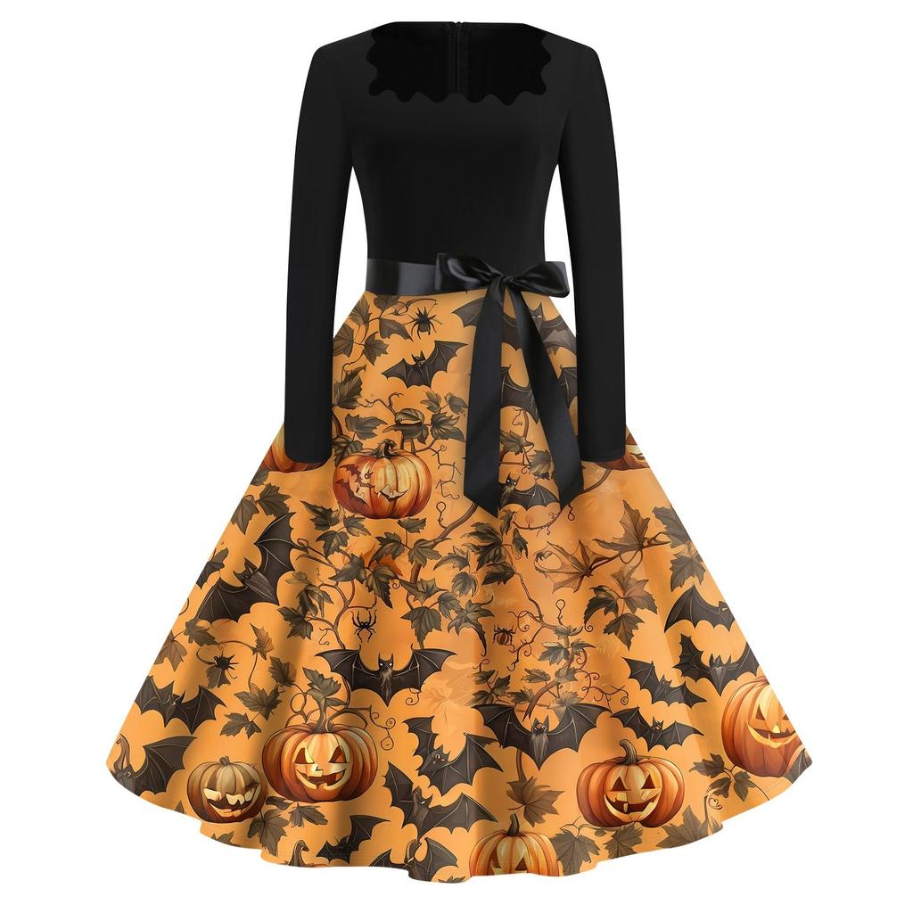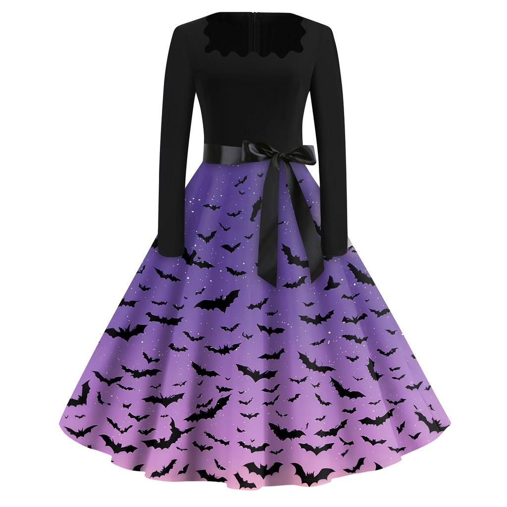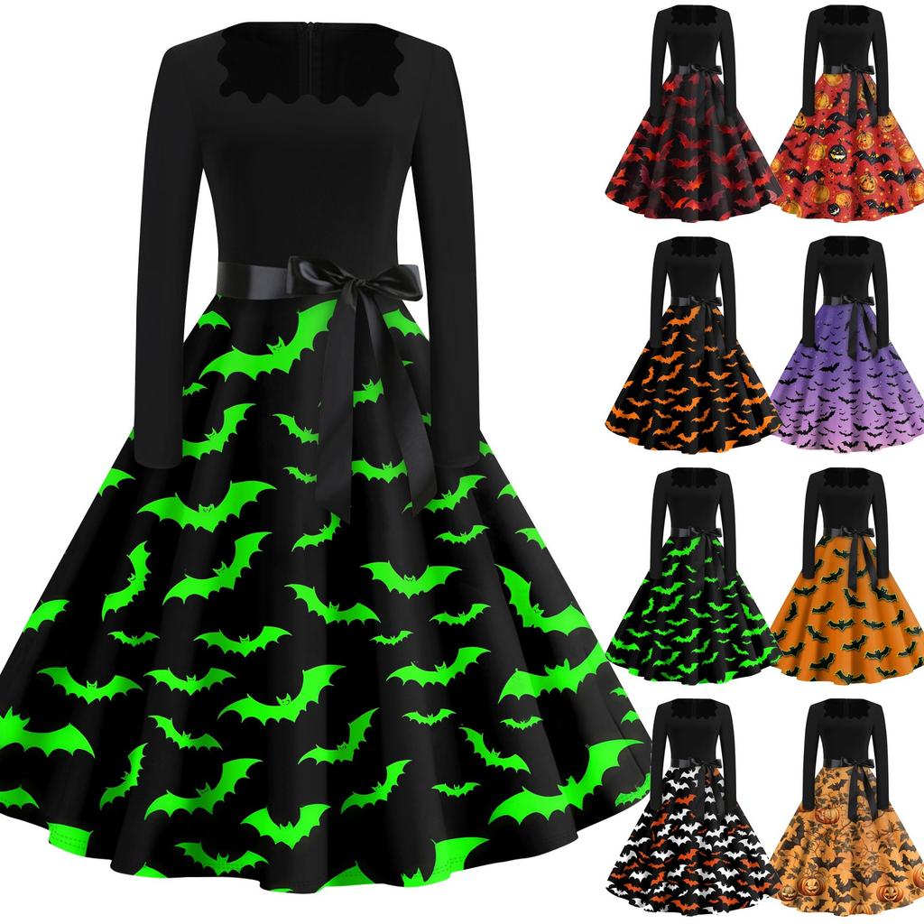Платье с расклешенным принтом на Хэллоуин для женщин, платье с длинным рукавом, полые вечерние повседневные платья