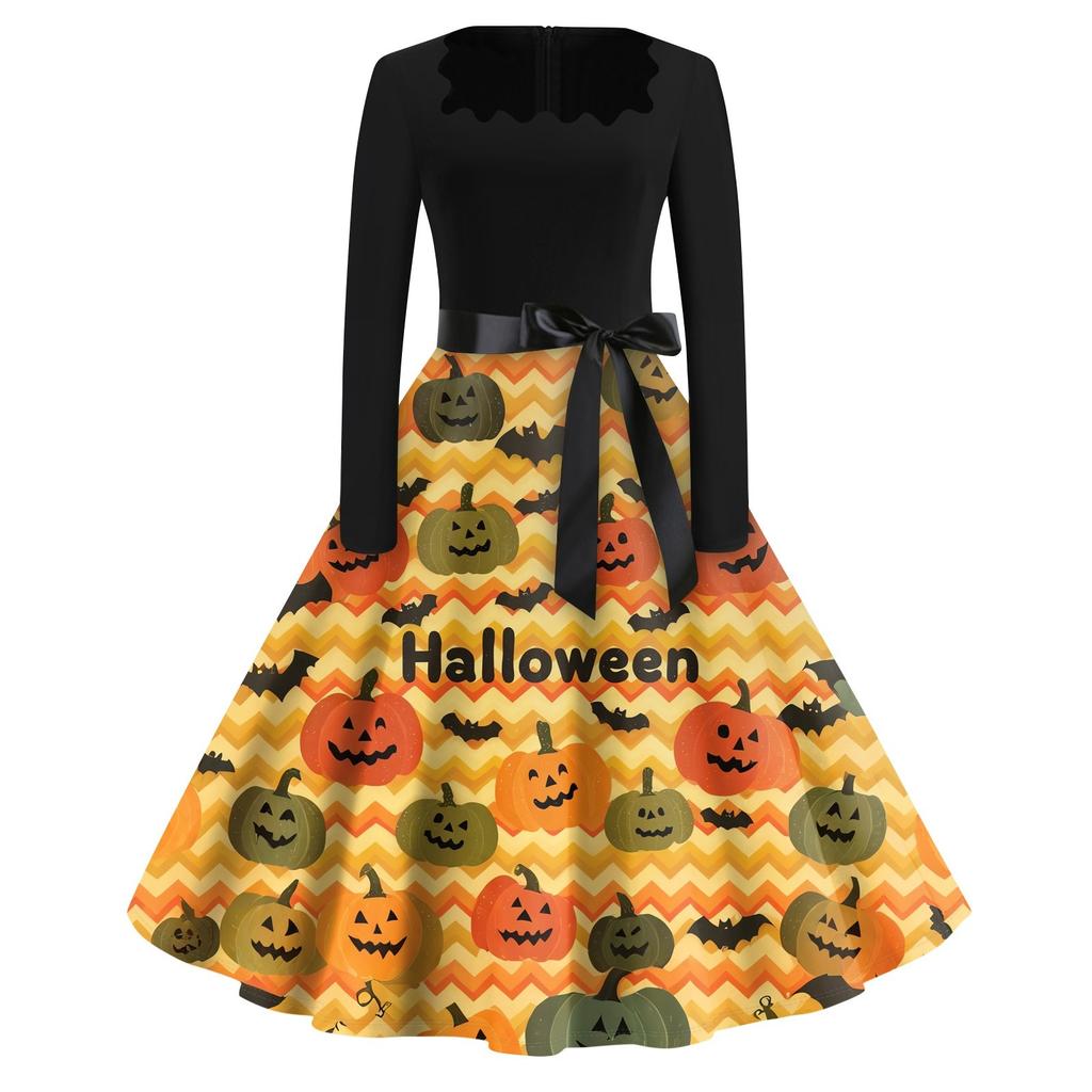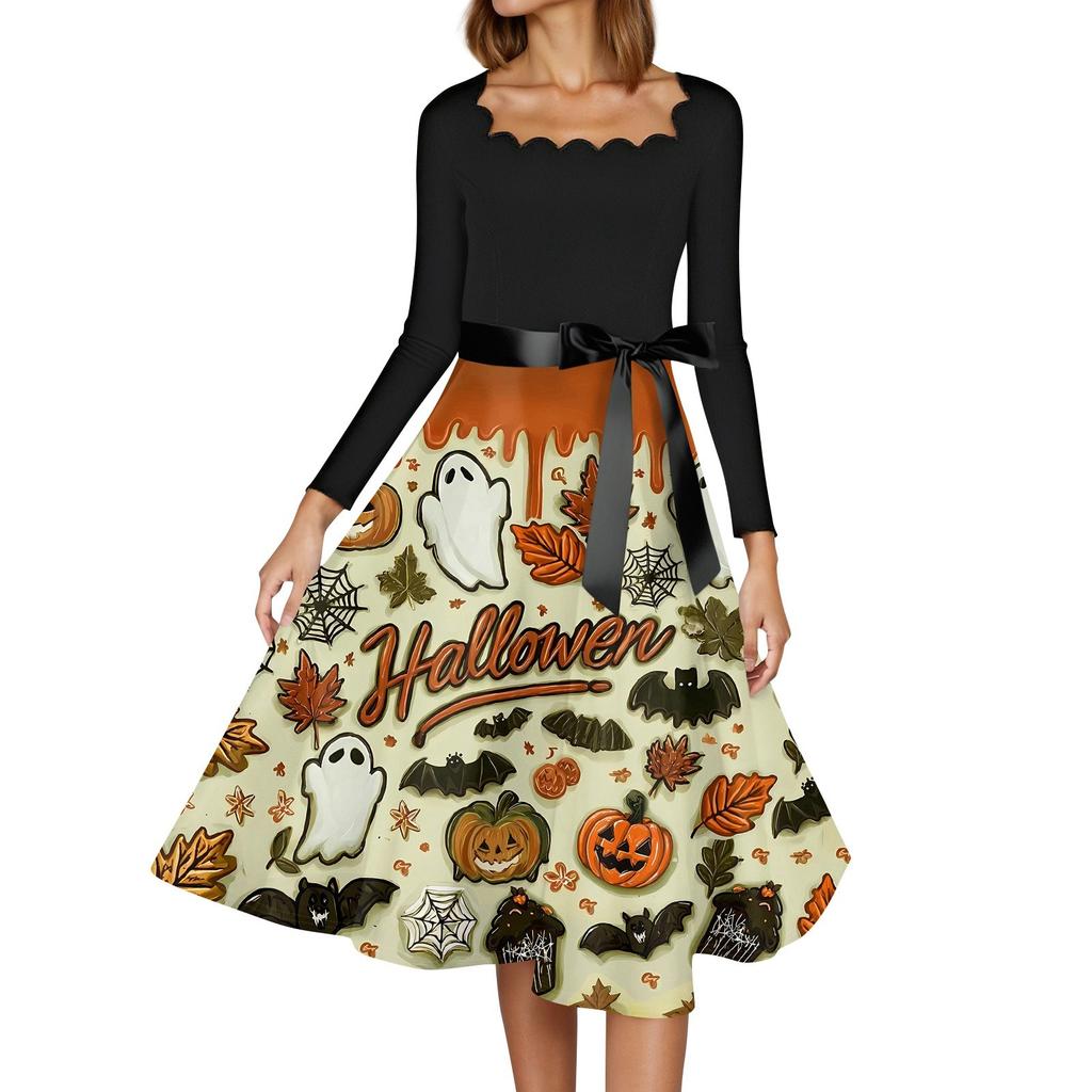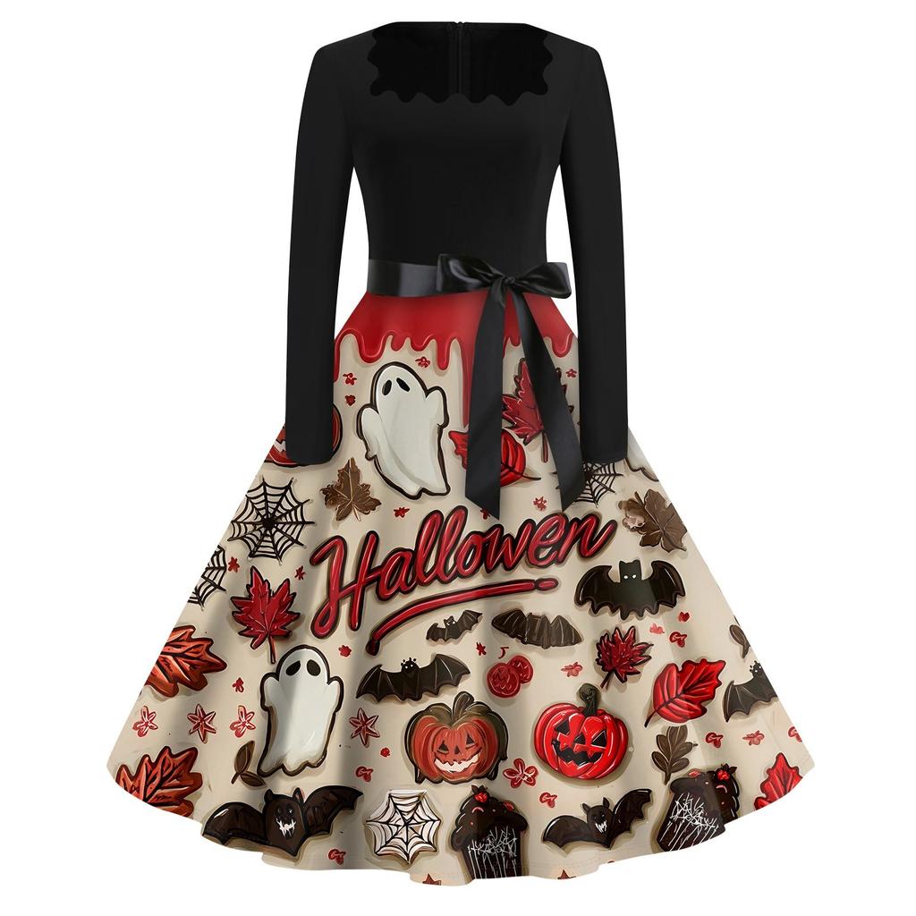 Платье с расклешенным принтом на Хэллоуин для женщин, платье с длинным рукавом, полые вечерние повседневные платья