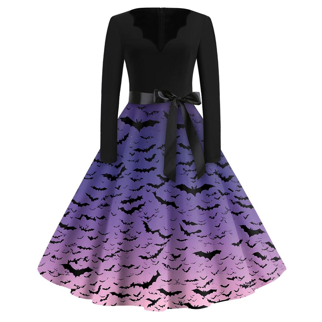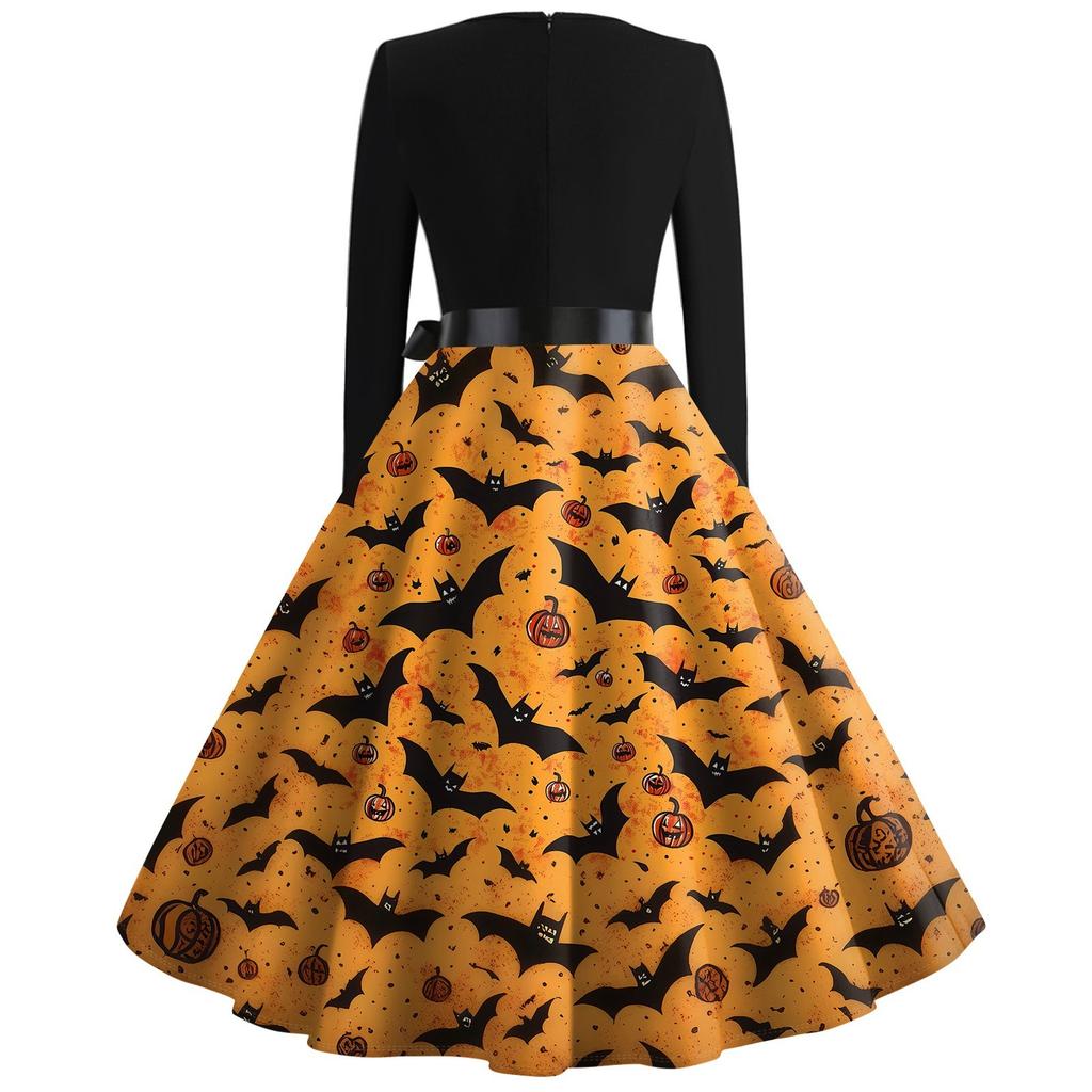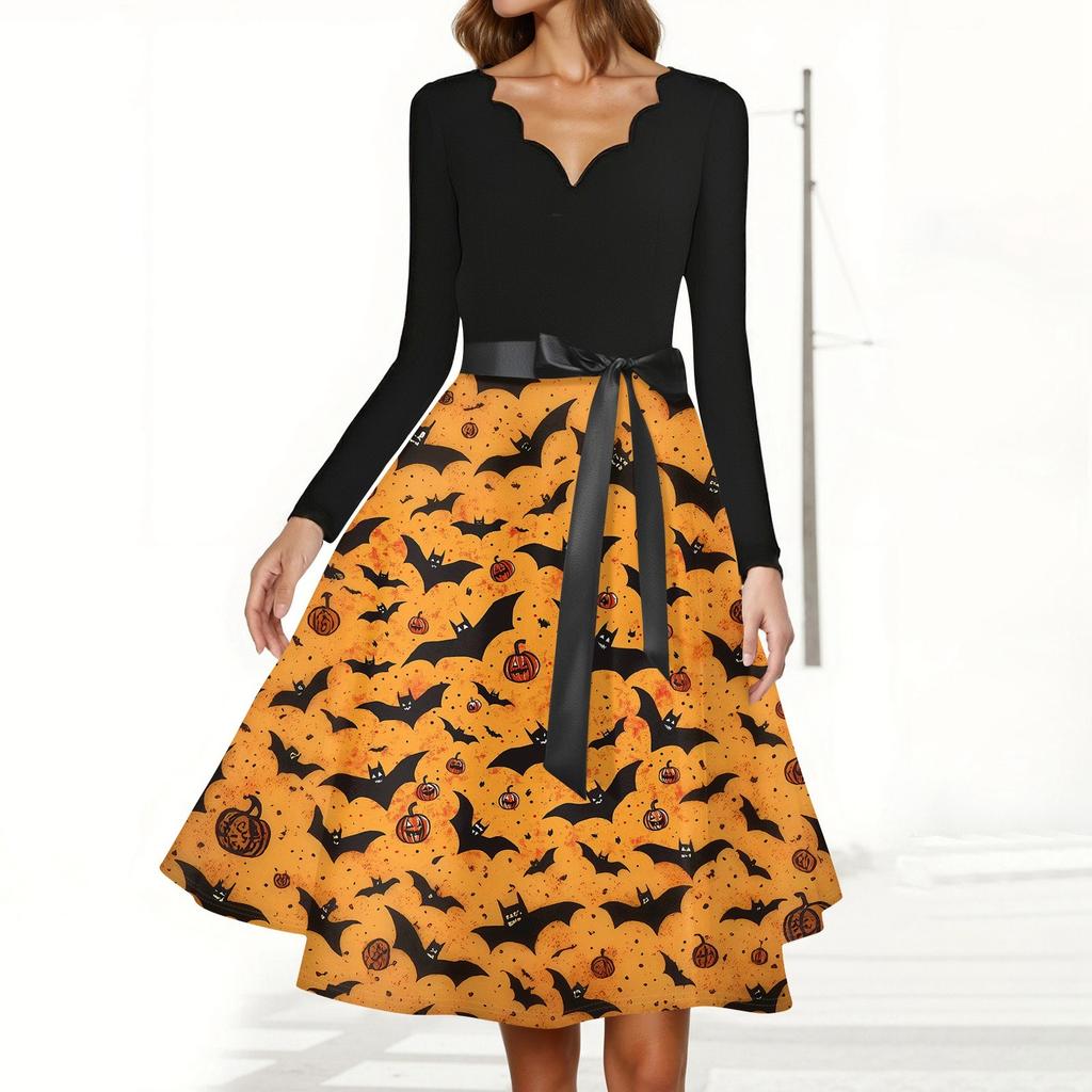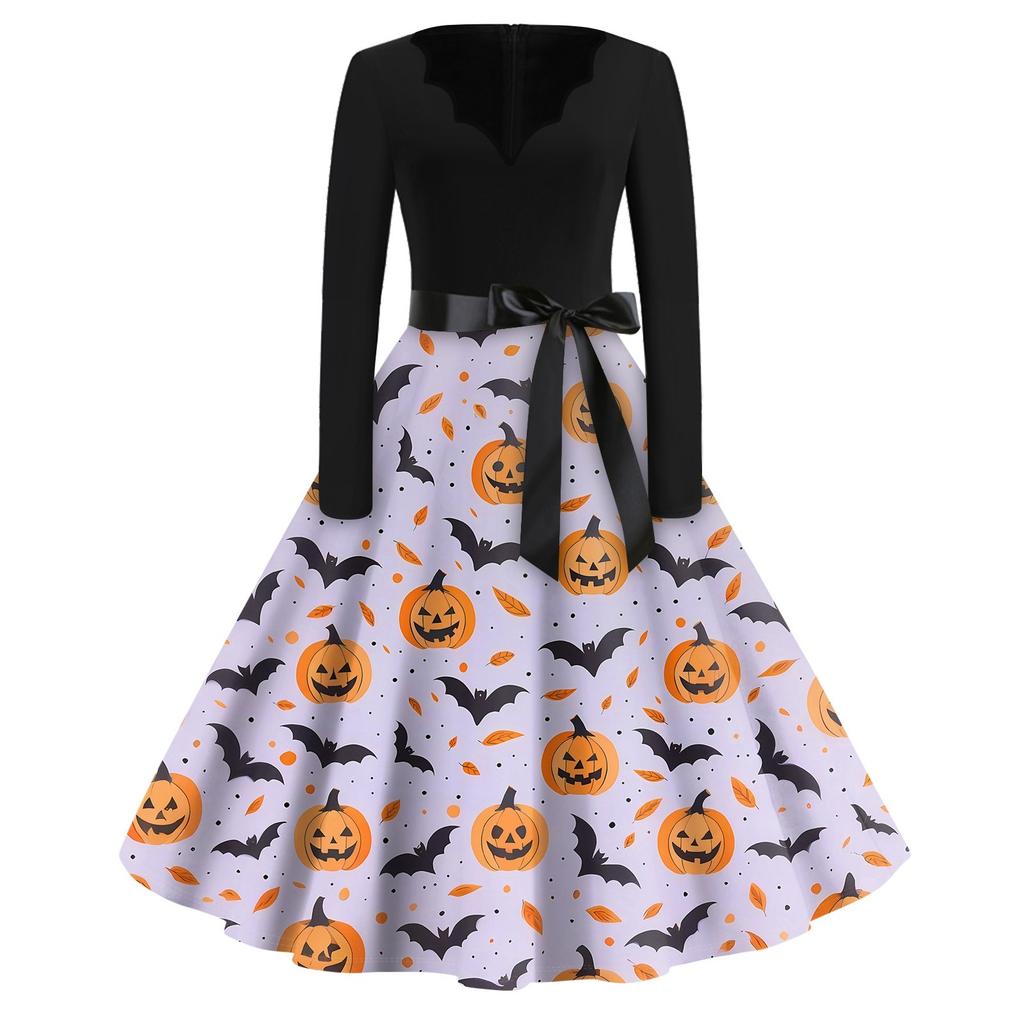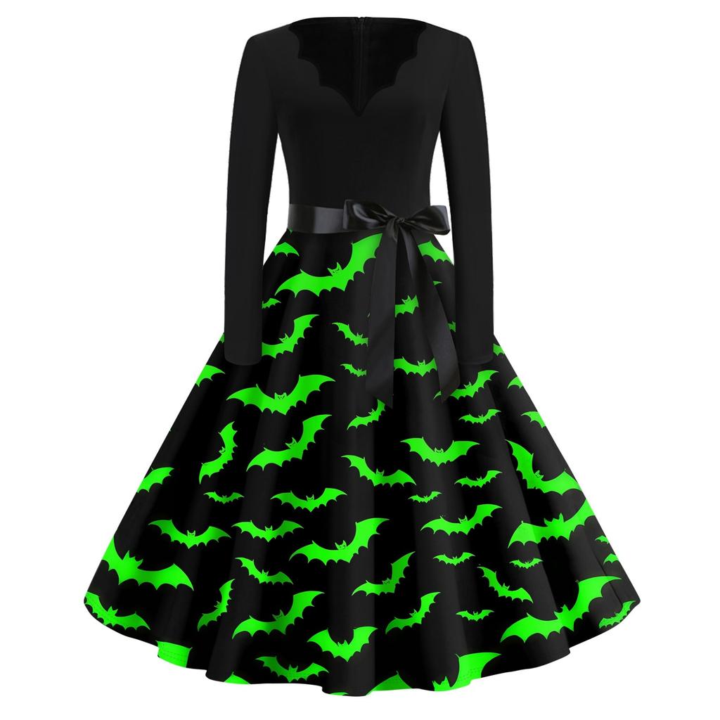 Платье с расклешенным принтом на Хэллоуин для женщин, платье с длинным рукавом, полые вечерние повседневные платья