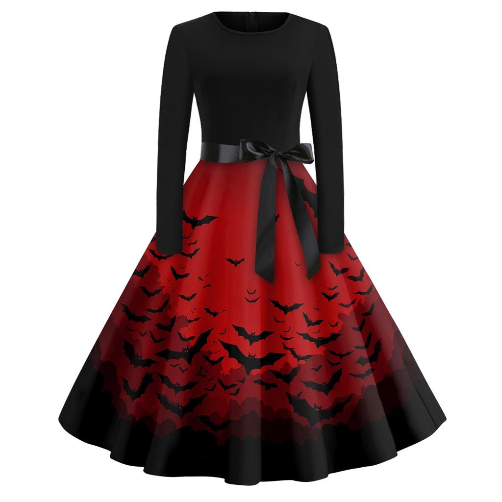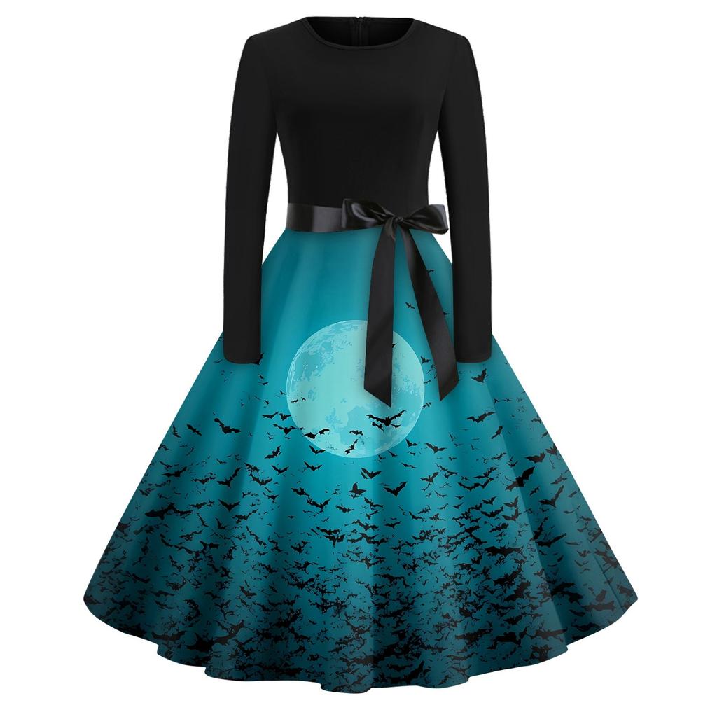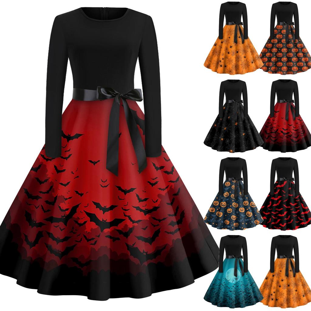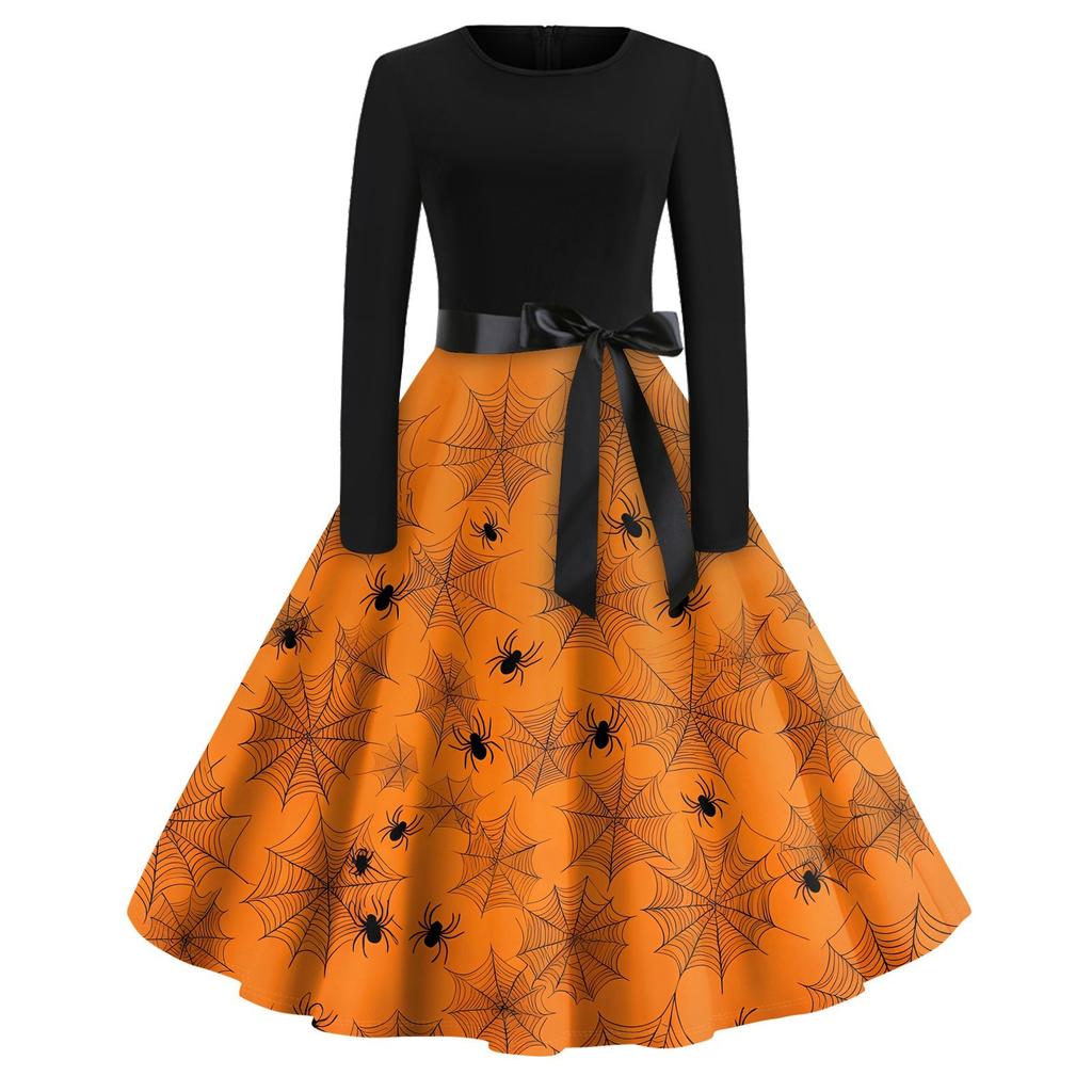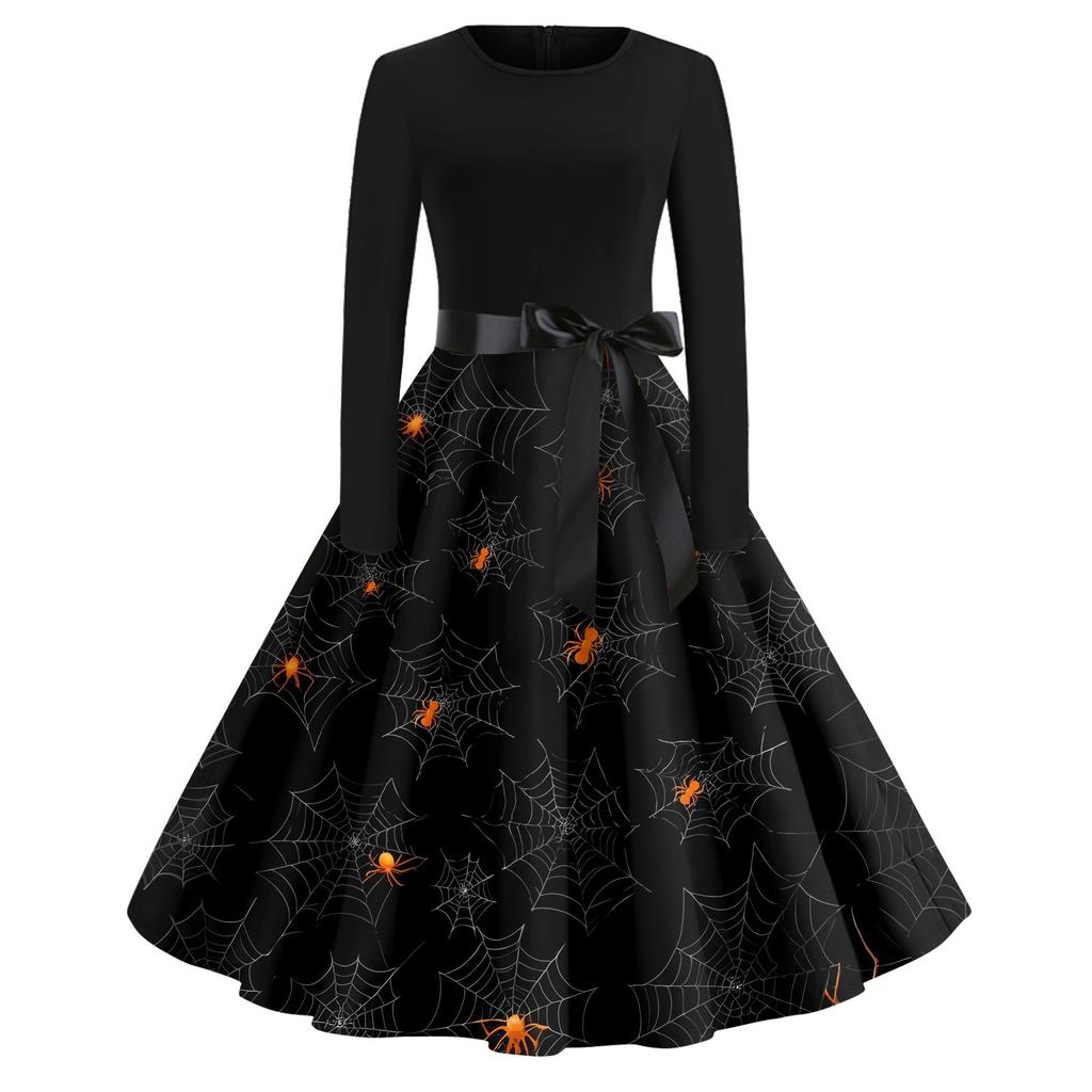 Платье-клеш с принтом на Хэллоуин для женщин с длинным рукавом, повседневные платья с круглым вырезом и ажурной отделкой