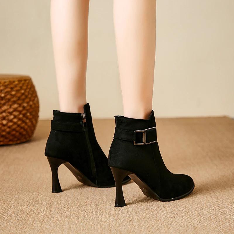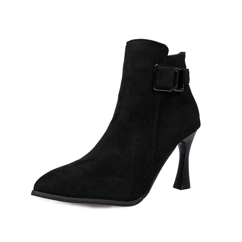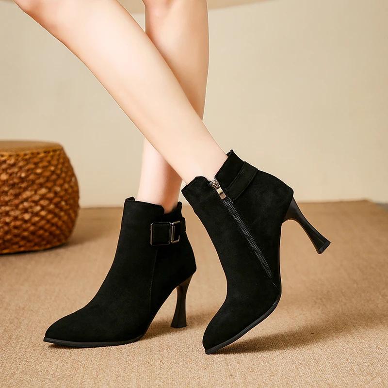 2024 Большие размеры обуви Женские ботильоны Женские сексуальные современные ботинки Женские металлические украшения Заостренный носок Боковая молния Тонкие каблуки Туфли