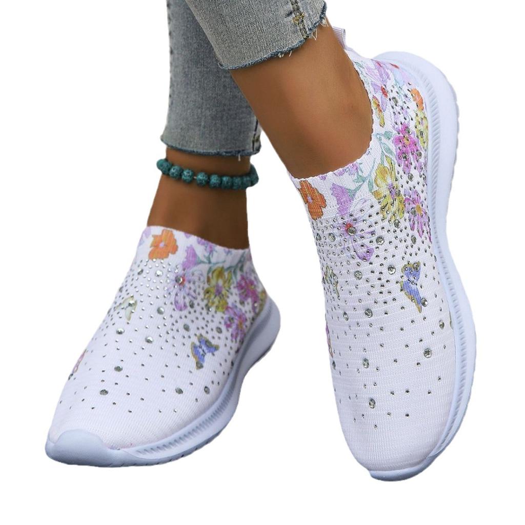 Цветочные принты трикотажные балетки для женщин больших размеров блестящие кристаллы дышащие сетчатые мокасины женские 2024 осень слипоны повседневная обувь