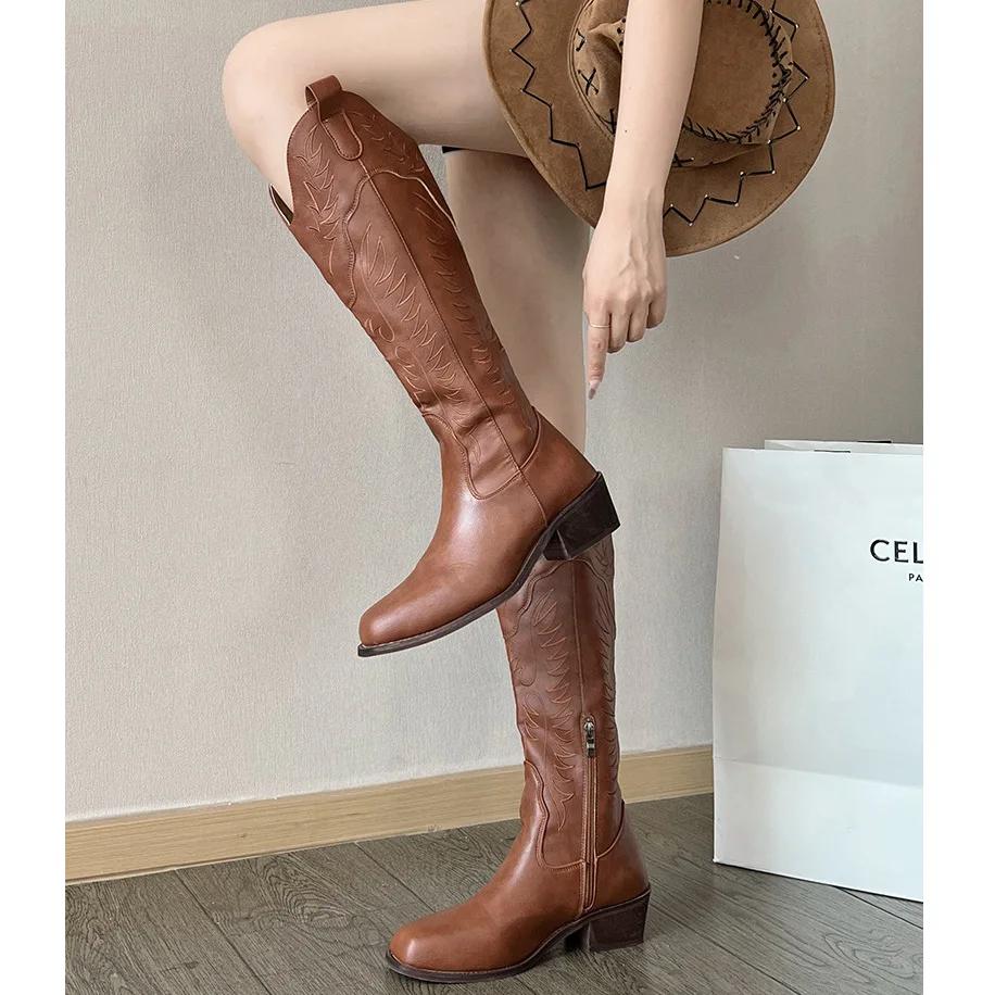 Женские коричневые длинные сапоги, осенние ковбойские сапоги в стиле ретро с вышивкой, квадратный носок, толстый каблук, сапоги длиной до колена, Botas Mujer