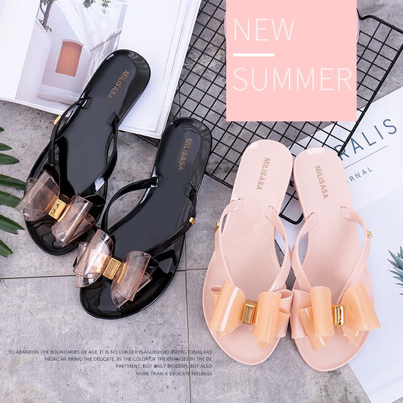2024 Летние женские шлепанцы для дома и улицы Тапочки с бантом Повседневные тапочки на плоской подошве ПВХ Желе Женские пляжные шлепанцы Обувь
