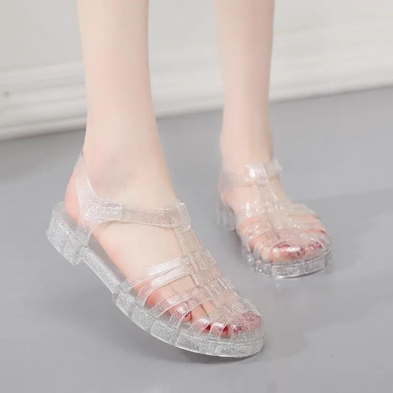Женские туфли из ПВХ-желе, летние женские сандалии на квадратном низком каблуке, прозрачные сандалии на платформе, женские повседневные босоножки с блестками и серебристыми вставками, женские сандалии