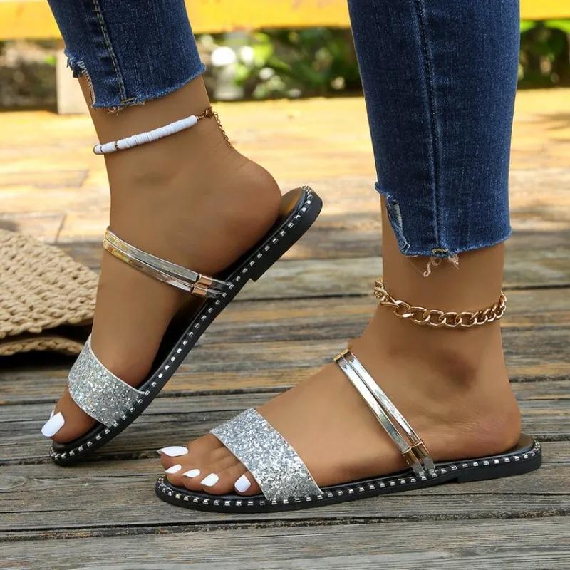 Сандалии женские на плоской подошве 2024 года, новые летние мягкие подошвы, универсальные и неутомимые ноги, одна линия с римскими туфлями Water Diamond — купить товар онлайн с бесплатной доставкой по всему миру!