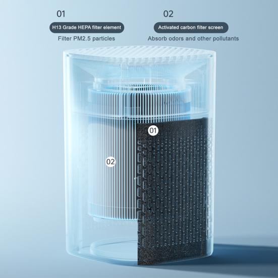 Оснащенный технологией двойной очистки воздуха, этот настольный очиститель обеспечивает активную глубокую очистку, эффективно адсорбируя пыль и устраняя запахи.. Встроенный HEPA-фильтр класса H13 нацелен на вторичный табачный дым, частицы PM2.5 и пыль, способствуя свежести и циркуляции чистого воздуха.