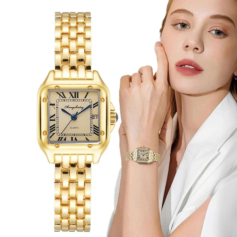 Роскошные женские квадратные кварцевые часы Женские модные наручные часы с золотым сплавным ремешком Качественные женские часы с римскими цифрами и датой