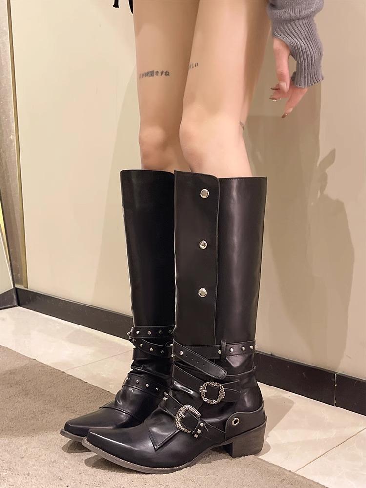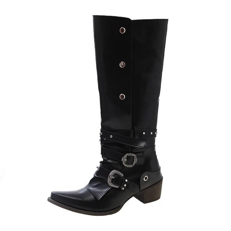 Длинные сапоги женские 2024 Новые остроносые сапоги на толстом каблуке до колена Черные сапоги в стиле панк Ретро роскошные туфли Zapatos De Mujer