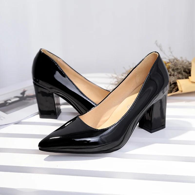 Роскошные женские красные туфли-лодочки черного цвета на высоком каблуке 7,5 см, женские лакированные туфли на толстом мелком каблуке, осенние туфли с острым носком, женские туфли без застежек