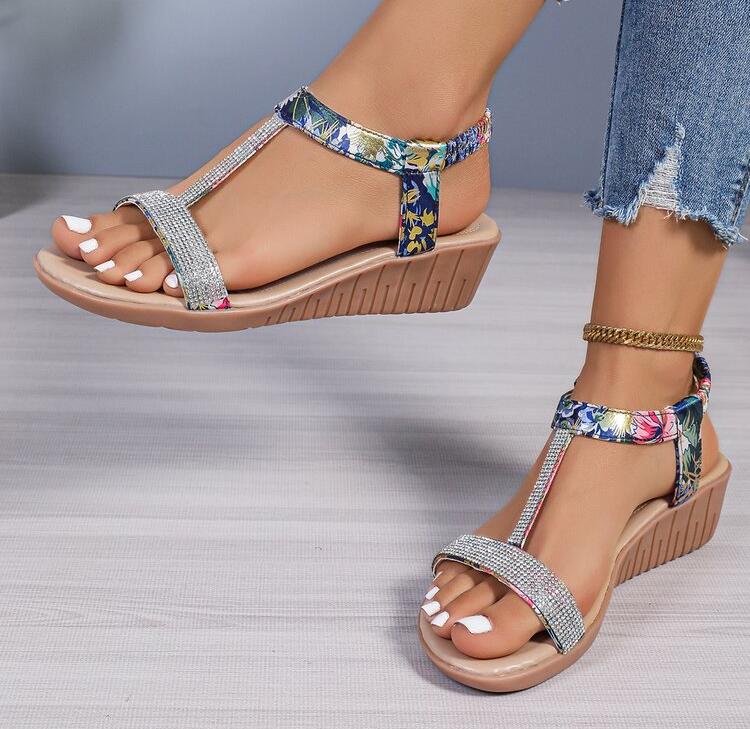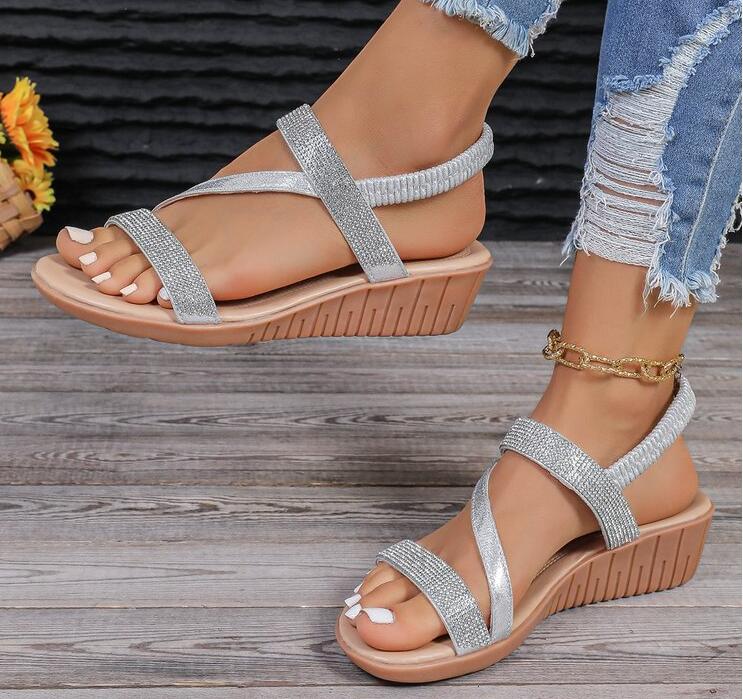 Сандалии женские летние 2024 года, новые универсальные туфли на танкетке с открытым носком и бриллиантами, женские туфли в римском стиле большого размера