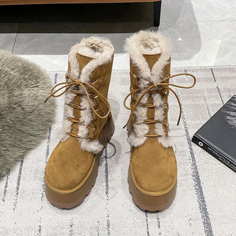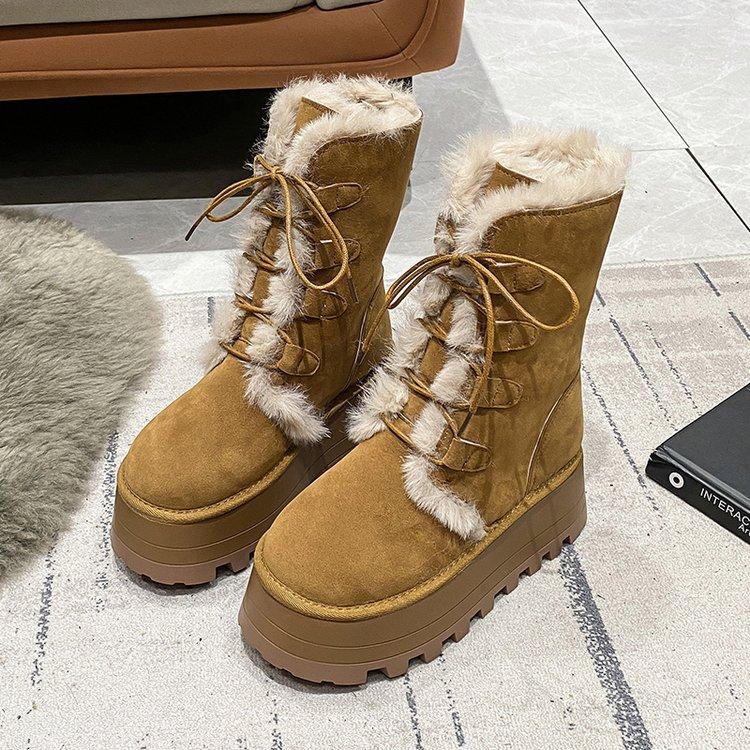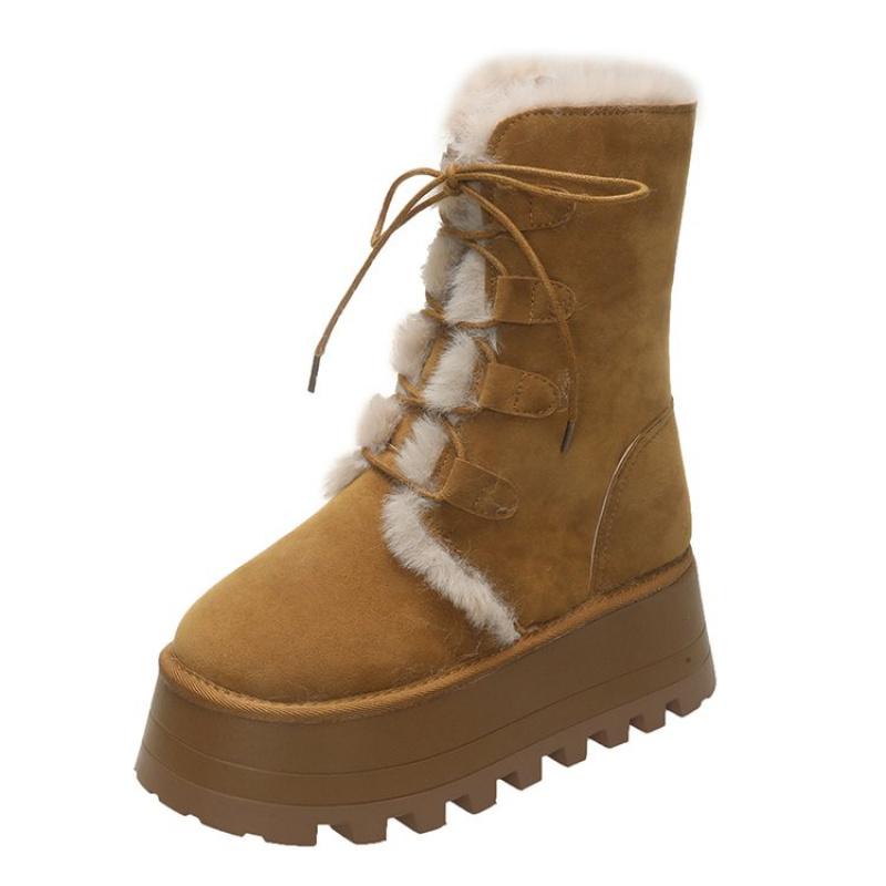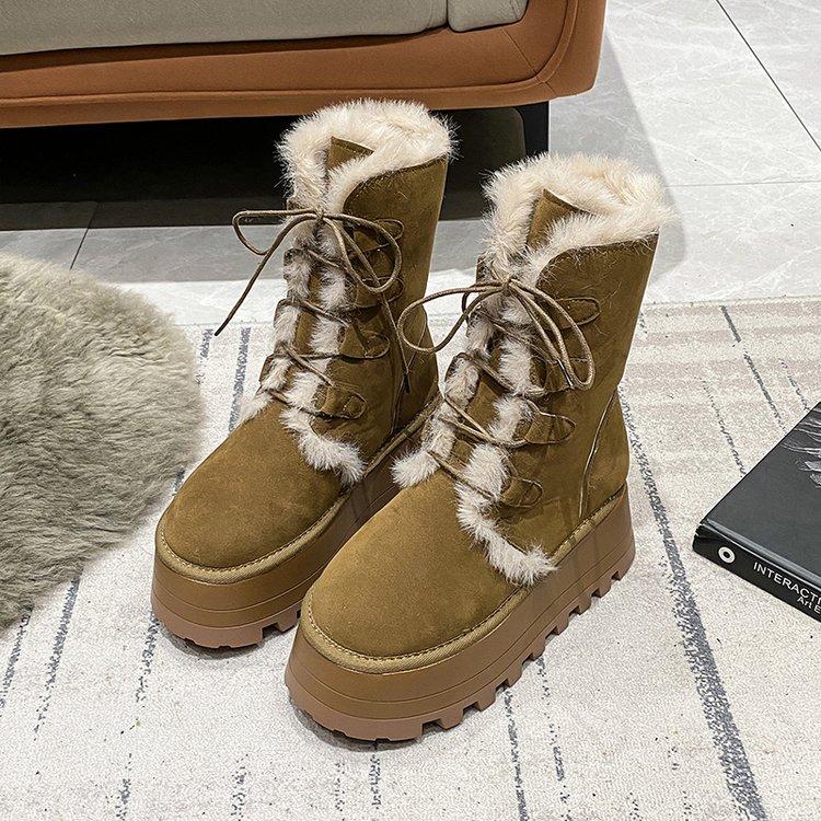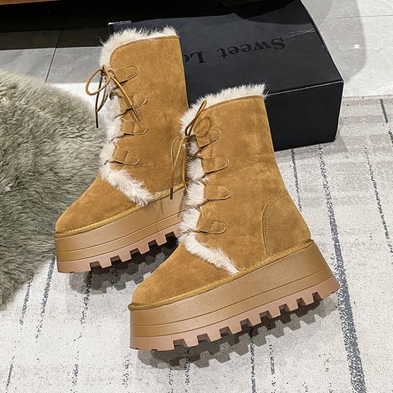 Женские зимние ботинки 2025 года из толстых плюшевых теплых материалов с подошвой толщиной 7 см, модные замшевые ботинки цвета хаки до середины голени для девочек из хлопка