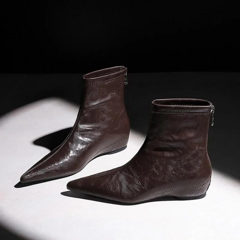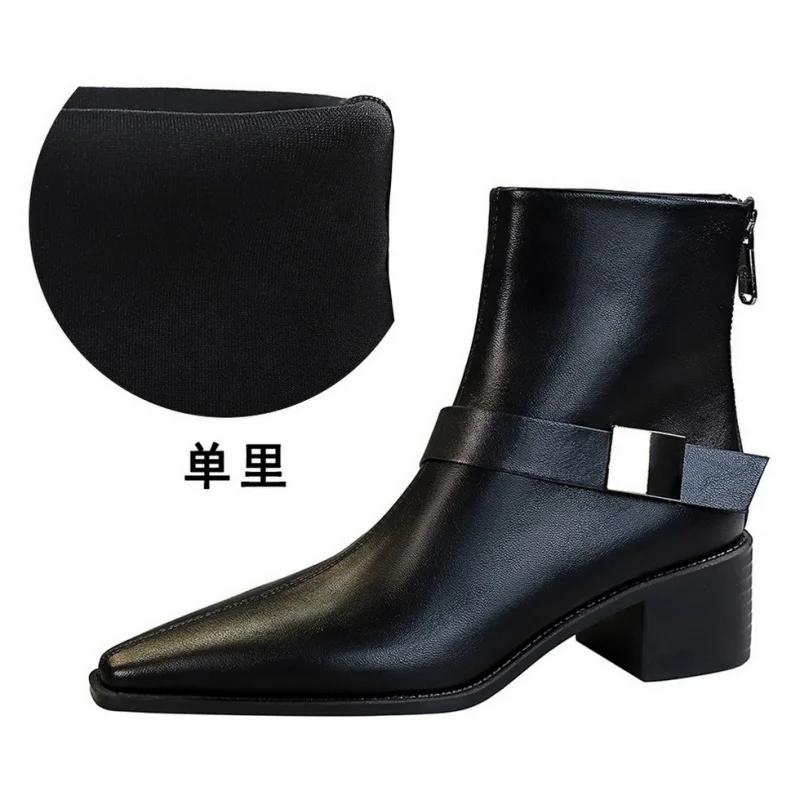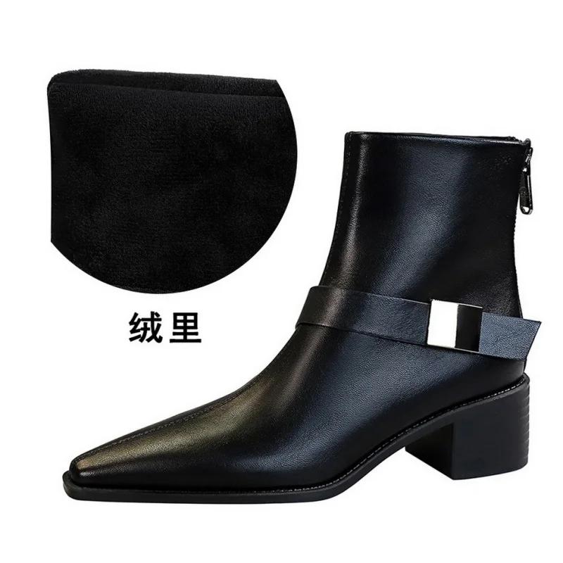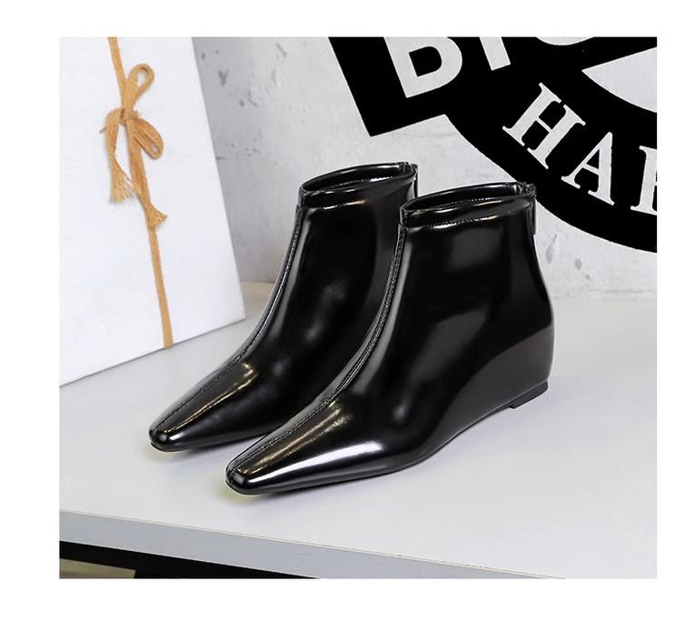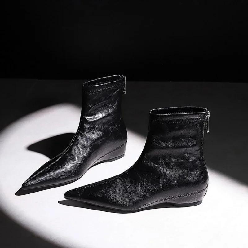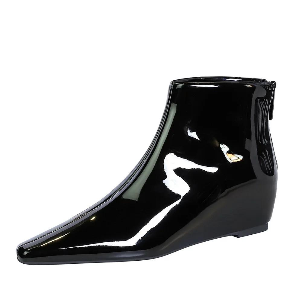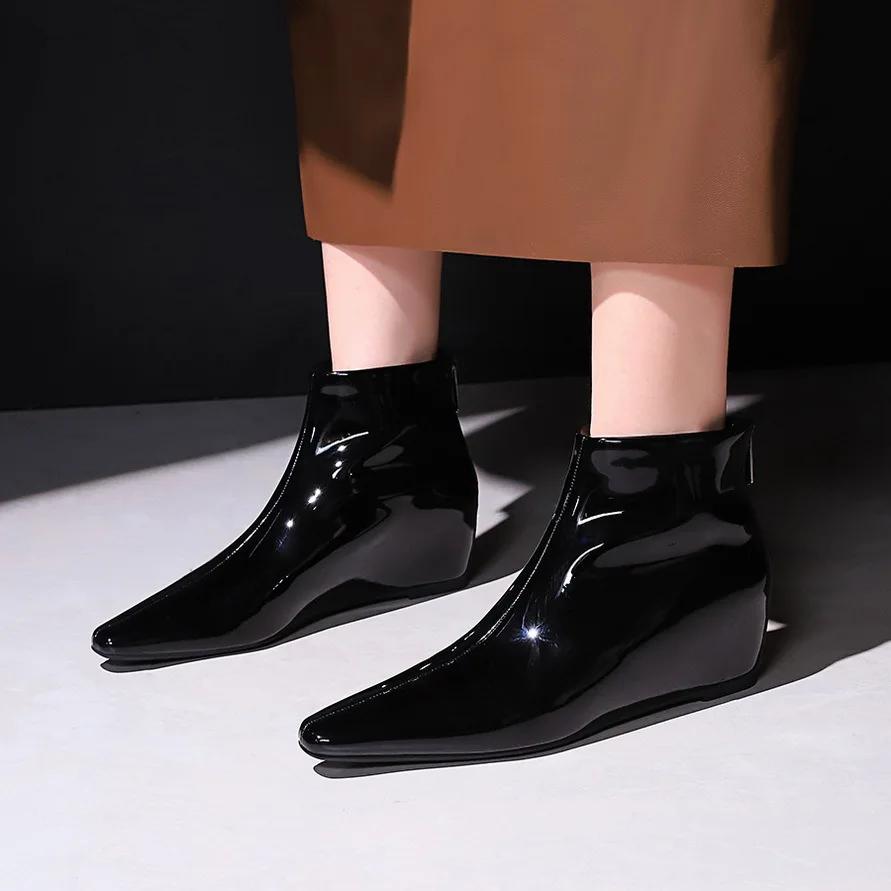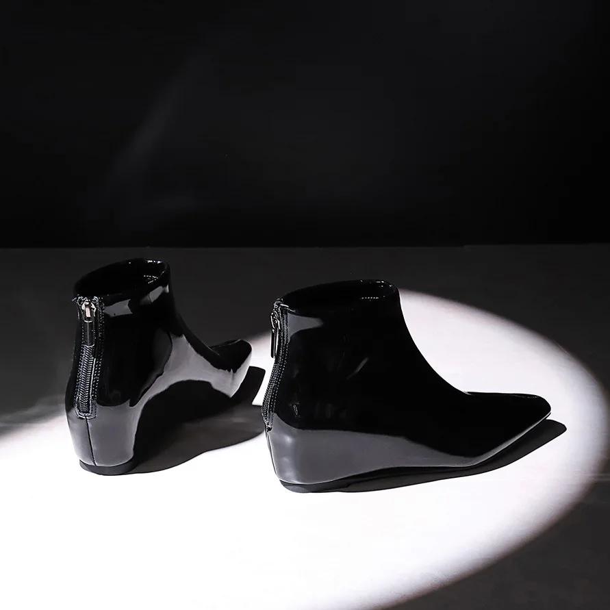 Женские черные лакированные ботильоны из натуральной кожи, винтажные короткие сапоги с заостренным носком, увеличивающие рост, 2024, зимние теплые рыцарские сапоги