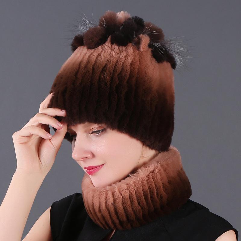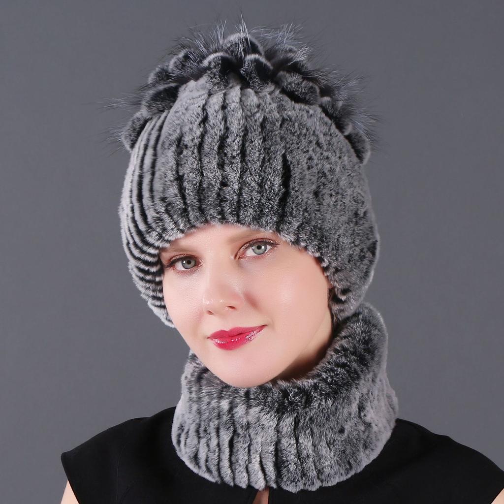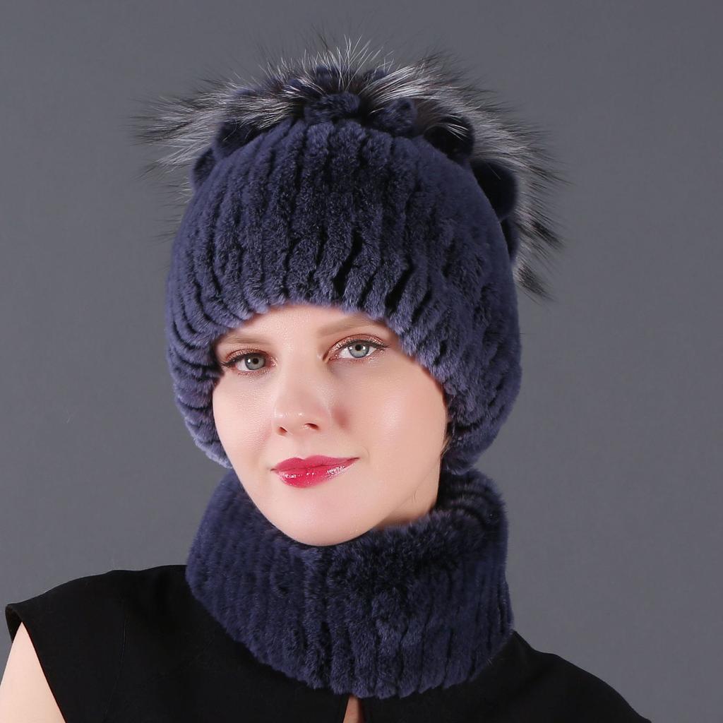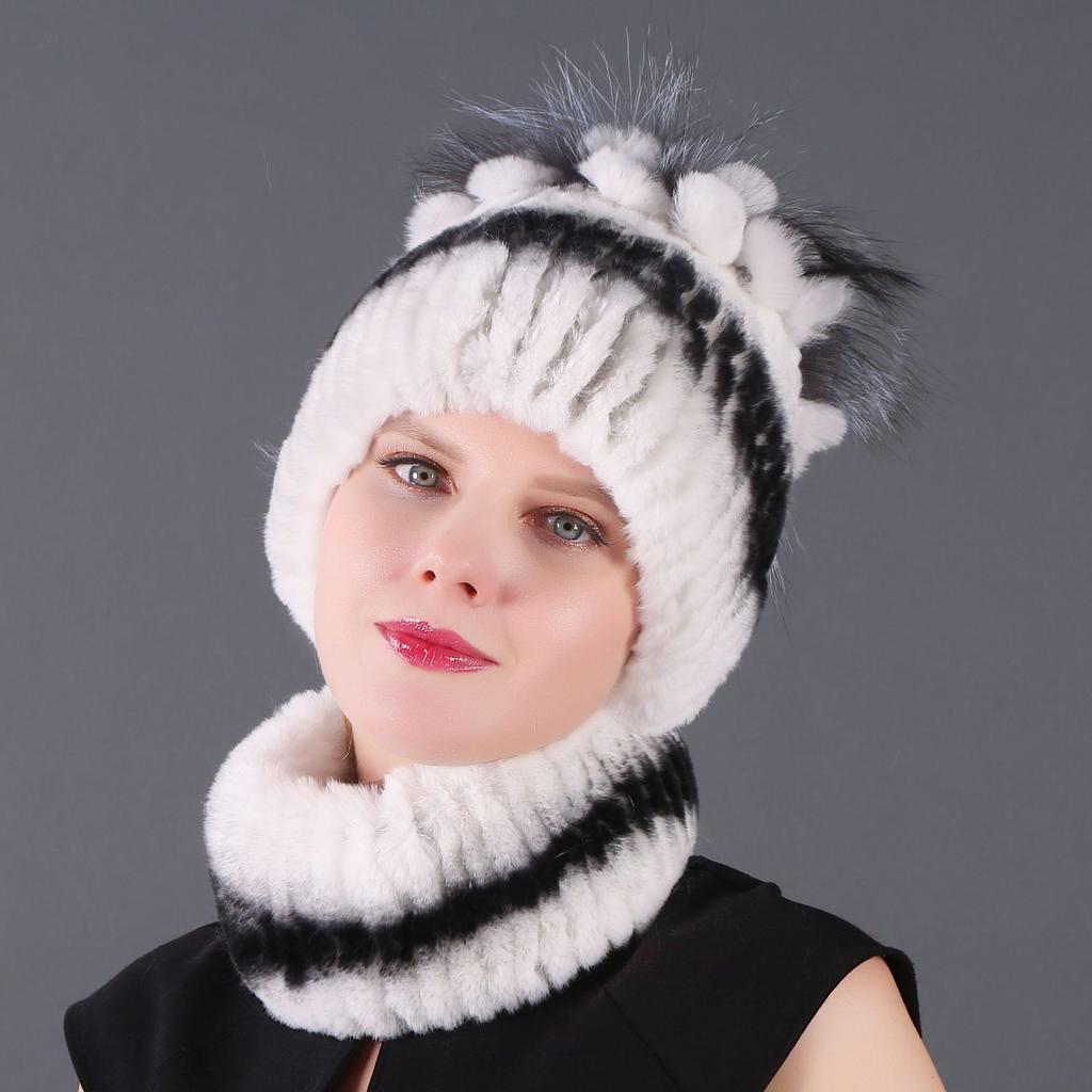 Женский новый комплект из двух предметов: короткая крашеная шапка-шарф из кролика рекс и чернобурки, зимняя теплая вязаная меховая шапка